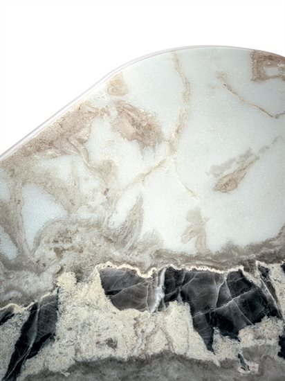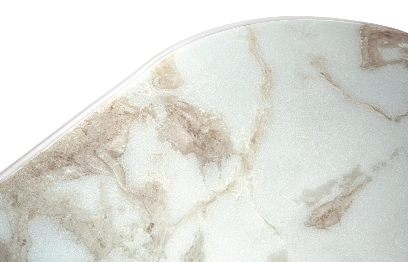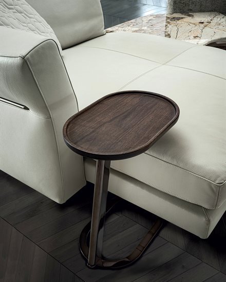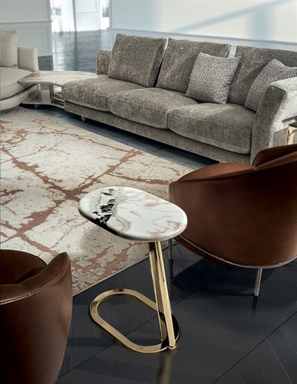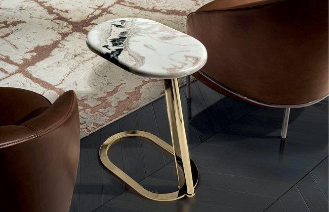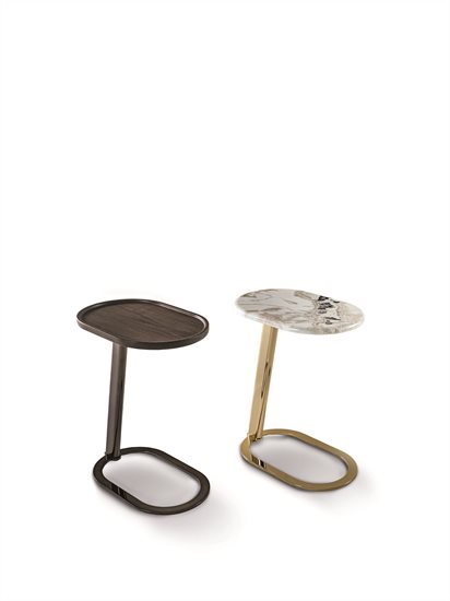 小茶几,金属底座与管状支撑柱采用激光切割制成,金属饰面可选:亮光渐变棕、黑玫瑰金、亮光浅金、哑光香槟金、亮光镀铬、亮光镀黑铬、哑光缎面青铜、亮光玫瑰金、哑光玫瑰金。台面推出两种版本:轮廓造型木质台面,采用染Macadamia色卡纳莱托核桃木制成;或大理石,厚度20mm外侧半圆磨边。大理石可选:Emperador Dark大理石、Verde Guatemala大理石、Bardiglio Nuvolato大理石、Palissandro Oniciato大理石、Silver Wave大理石、Agatha Black大理石、Calacatta Gold大理石、Dover White大理石、Rosso Levanto大理石、Elegant Brown大理石、Frappuccino大理石、Corteccia大理石、Panda White大理石、Sahara Noir大理石(聚酯面漆)、Calcite Azul大理石、Port Saint Laurent大理石、Fusion Light大理石、Patagonia大理石、Explosion Blu大理石、Fusion Multicolor大理石、Quarzo Juliet大理石、Azul Macauba大理石、Portoro大理石、红色缟玛瑙、象牙白缟玛瑙、白色缟玛瑙。
