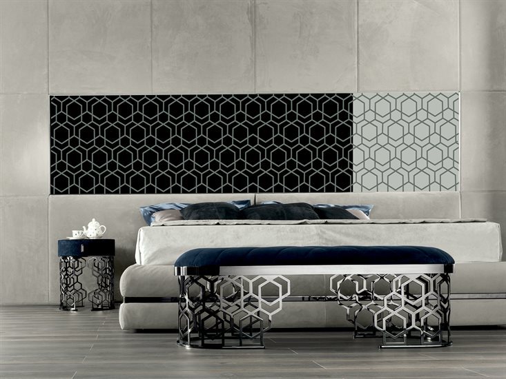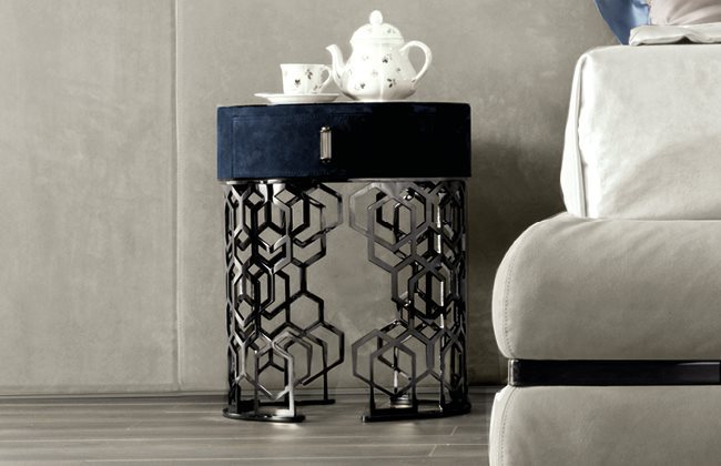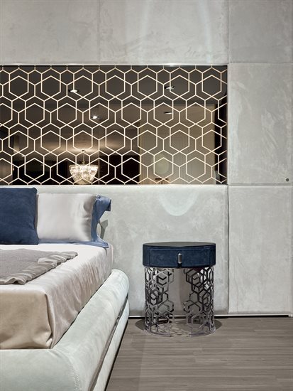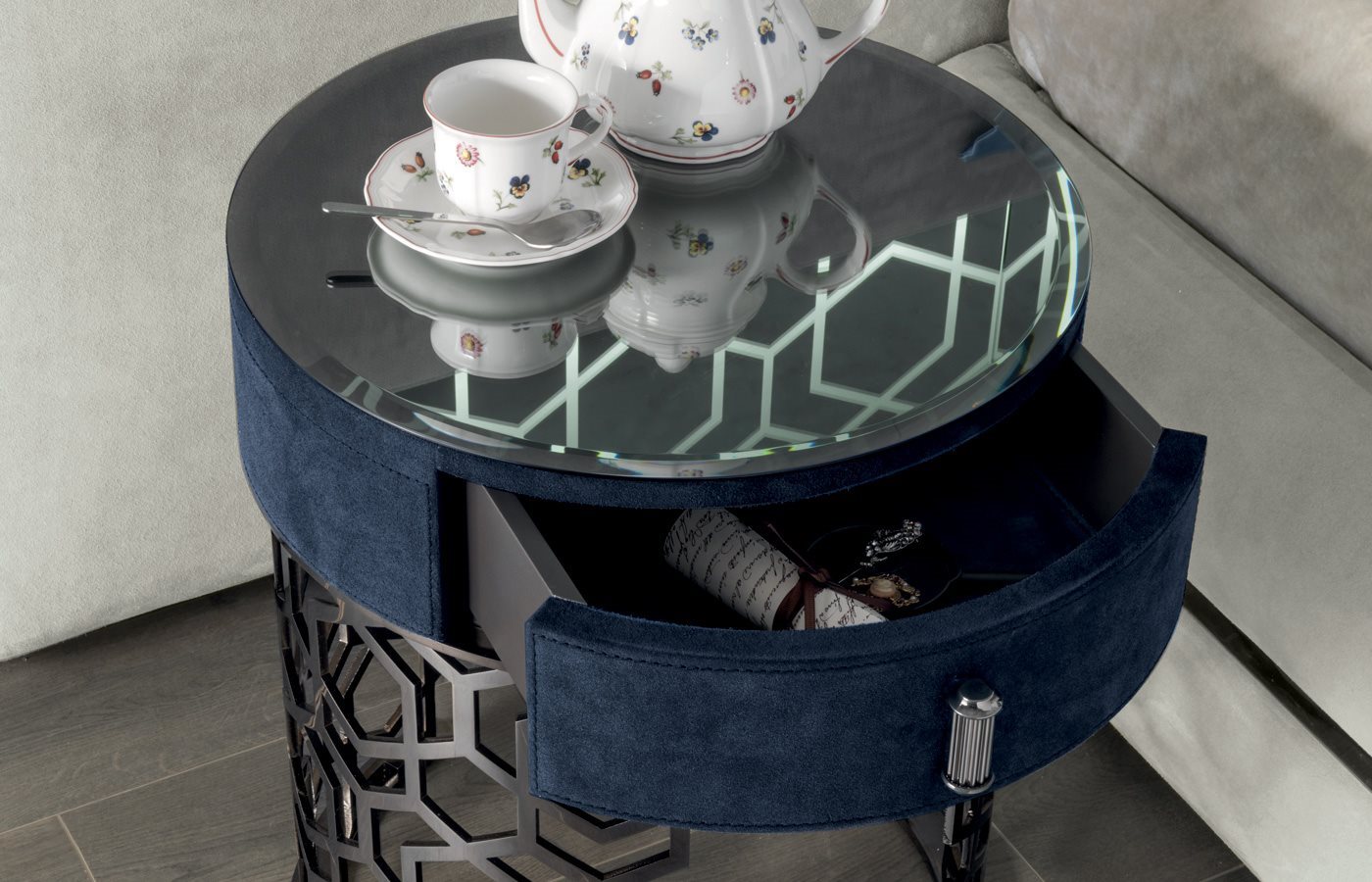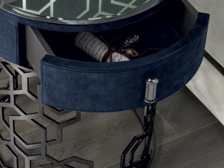 床头柜带小抽屉,皮料覆面依样本挑选,金属底座采用磨削工艺搭配激光切割「Sequence」装饰纹以及压延处理制成。底座饰面可选:亮光渐变棕、亮光浅金、哑光香槟金、亮光镀铬、亮光镀黑铬、哑光缎面青铜、亮光玫瑰金、哑光玫瑰金、黑玫瑰金。