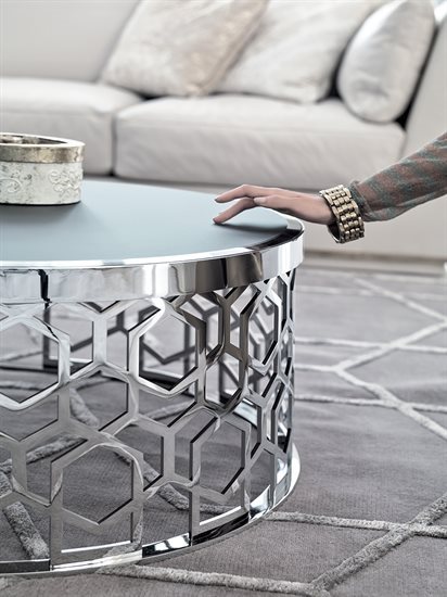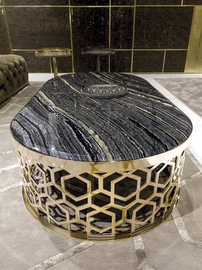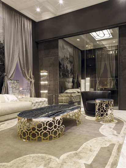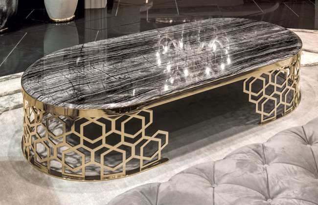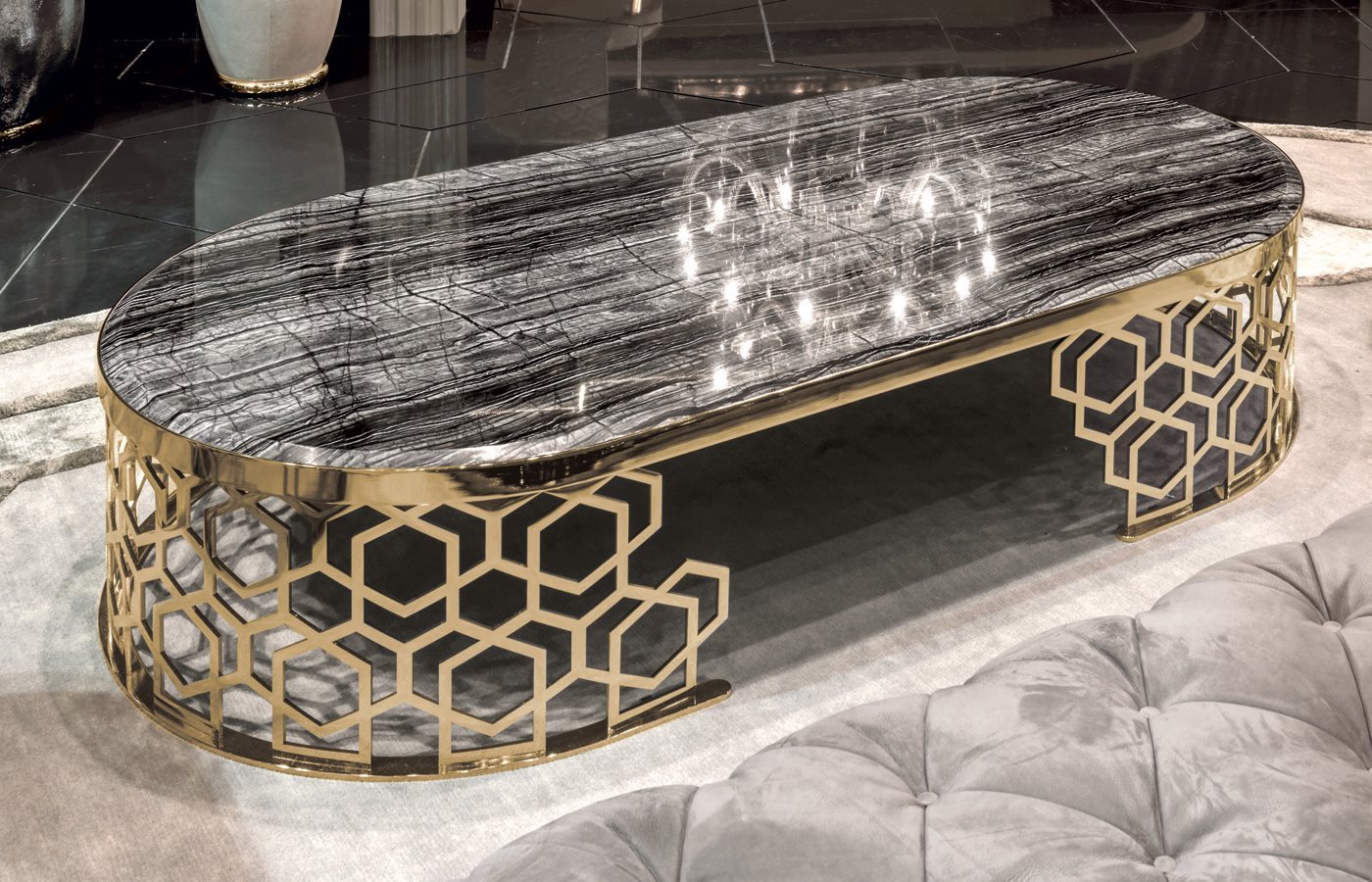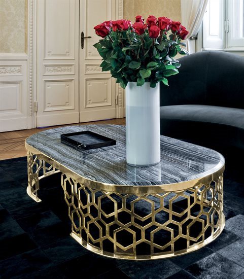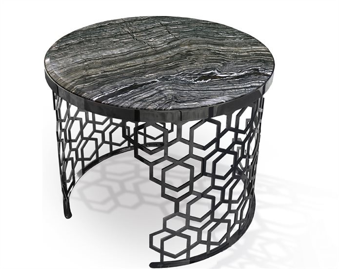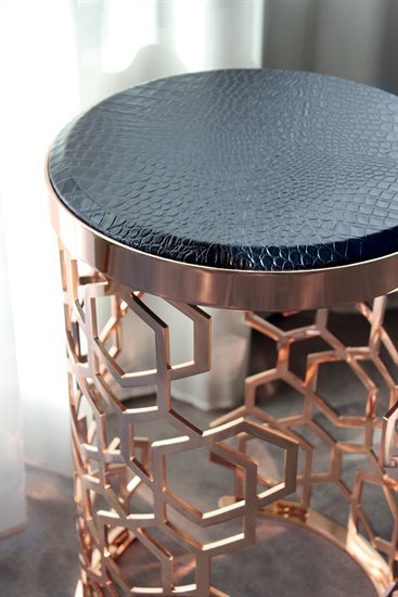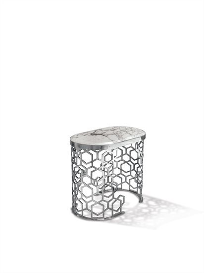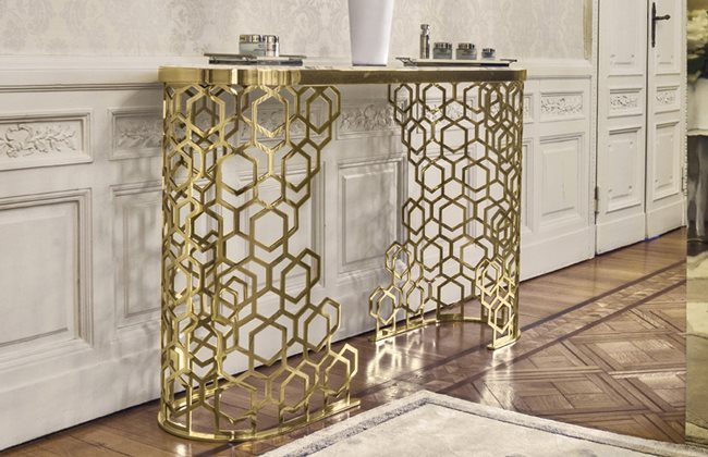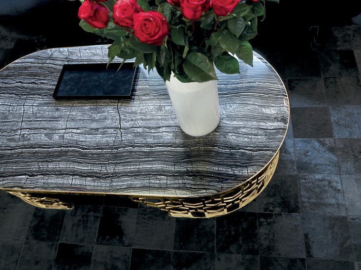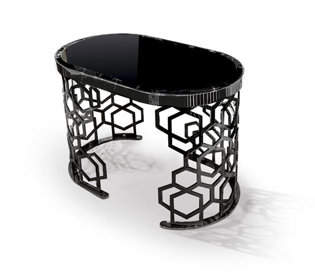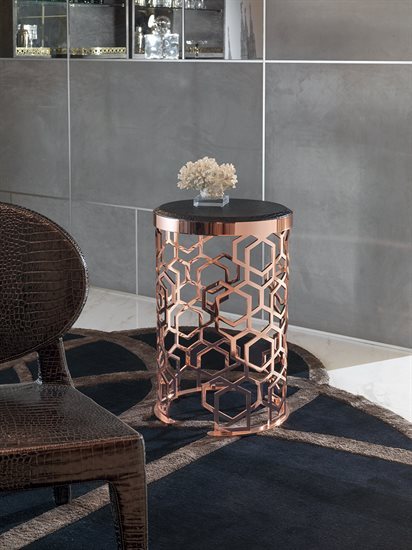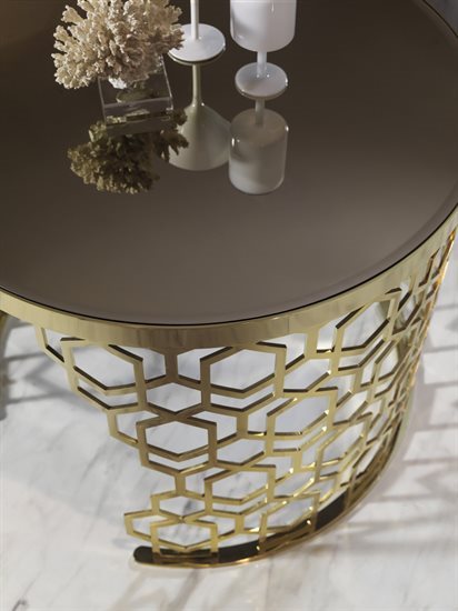 茶几∕玄关桌,底座采用磨削工艺搭配激光切割「Sequence」装饰纹以及压延处理制成。结构饰面:黑玫瑰金、亮光浅金、亮光渐变棕、哑光香槟金、亮光镀铬、亮光镀黑铬、哑光缎面青铜、亮光玫瑰金、哑光玫瑰金。