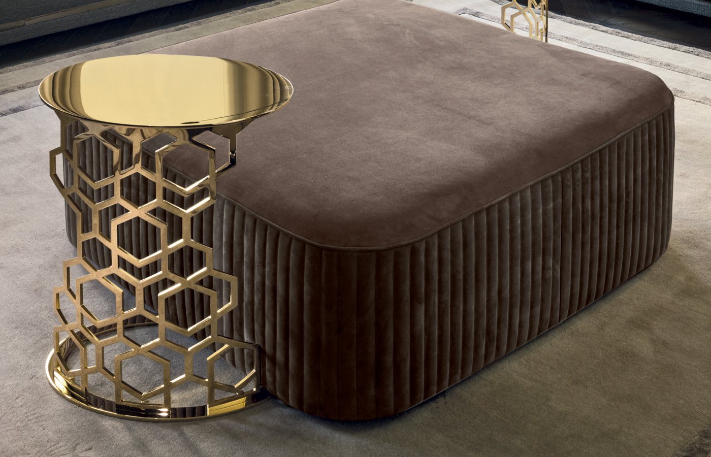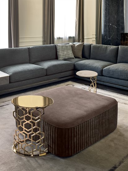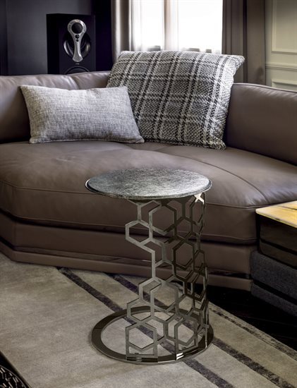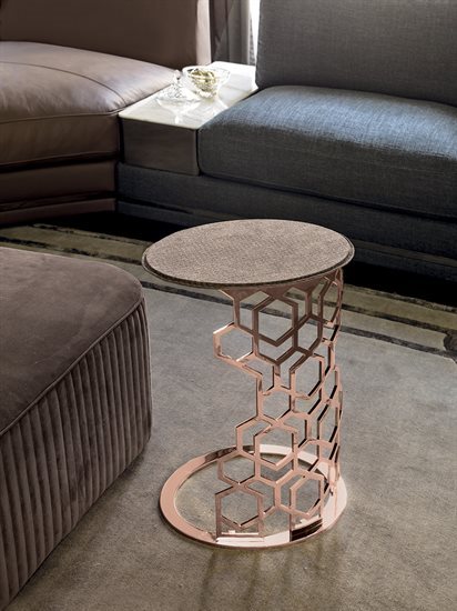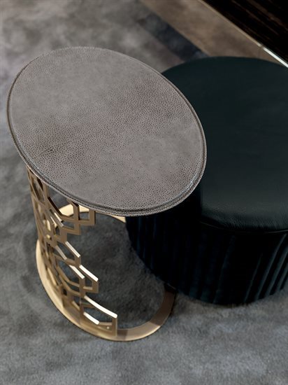 小茶几带金属底座,金属饰面可选:黑玫瑰金、亮光浅金、亮光渐变棕、哑光香槟金、亮光镀铬、亮光镀黑铬、哑光缎面青铜、亮光玫瑰金、哑光玫瑰金。台面的金属可与结构相同,或者依样本挑选皮料覆面。