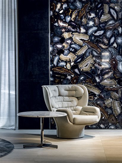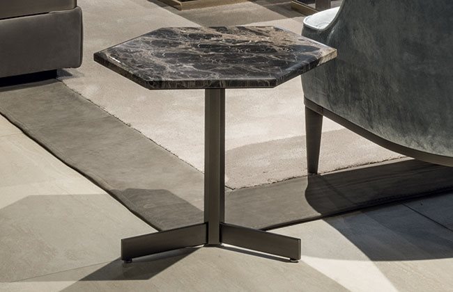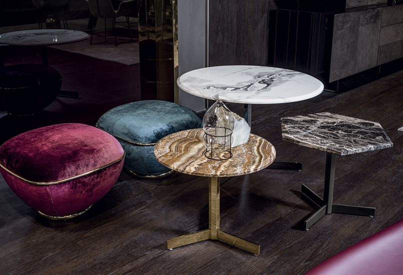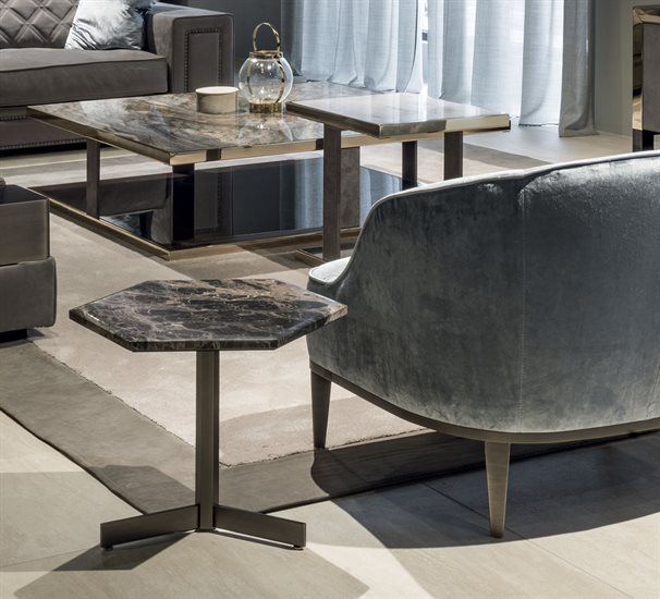 一系列不同尺寸与高度的茶几,金属结构采用磨削工艺制成,饰面可选:亮光浅金、亮光渐变棕、哑光香槟金、亮光镀铬、亮光镀黑铬、哑光缎面青铜、亮光玫瑰金、哑光玫瑰金、黑玫瑰金。