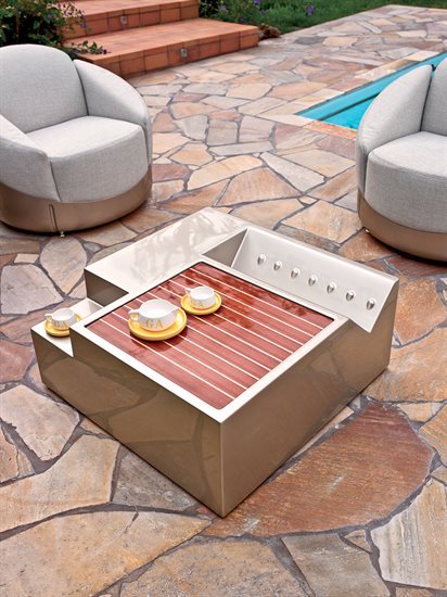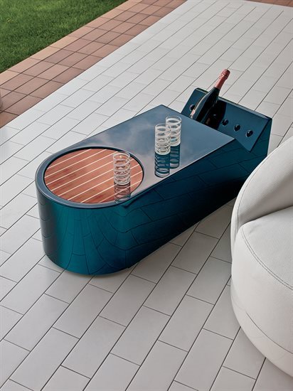 主体框架由玻璃纤维制成,在模具中手工分层后单件逐 个提取。 框架外侧使用白色或黑色凝胶,金属色款则采用手工上 漆和窑炉烘干。 可以添加嵌有白枫木图案的光面桃花心木置物台面,或 使用带羊毛面料覆裹的台面。 外框颜色有光面白色和光面黑色。 金属色:古铜、灰色、蓝色。 不要将产品暴露于恶劣的天气和气候环境,也不要靠近 超过40度的热源。即便是专用于户外的产品,随着时间 推移也会收到天气环境影响。 光面桃花心木茶几表面,嵌有白枫木条纹图案。 坐凳垫由经抗斑处理的防水羊毛面料覆裹。