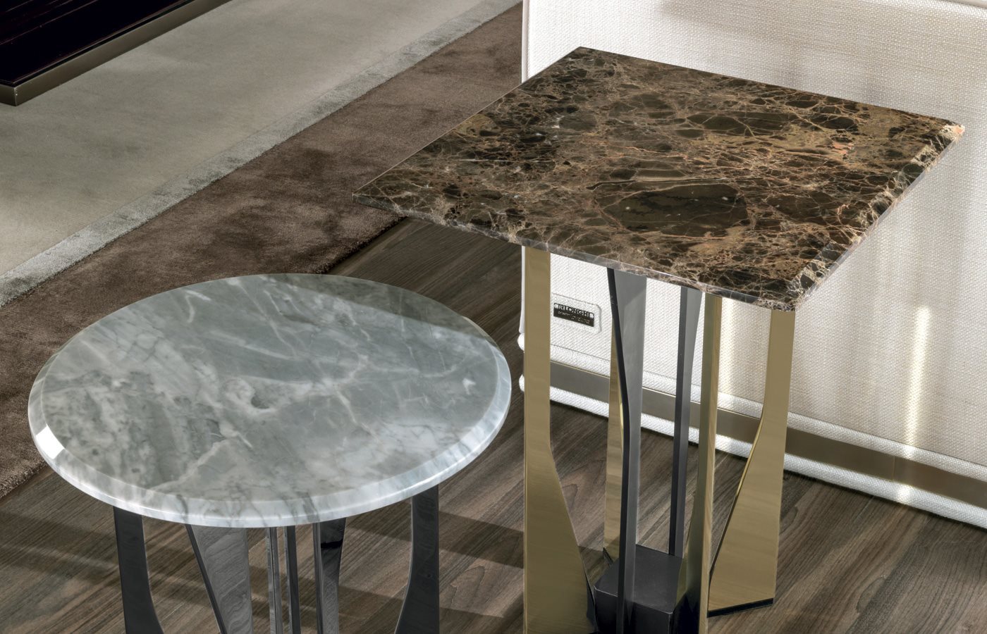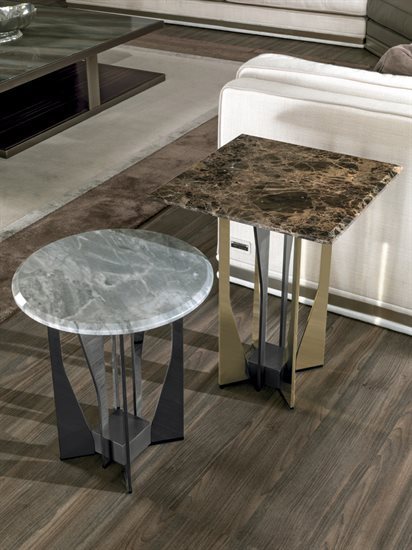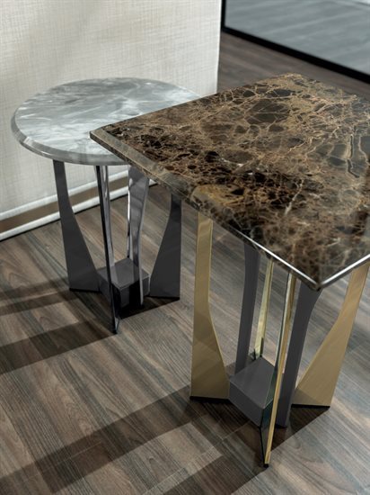 茶几带金属底座,金属可选以下饰面:黑玫瑰金、亮光浅金、亮光渐变棕、哑光香槟金、亮光镀铬、亮光镀黑铬、哑光缎面青铜、双色版本包括:亮光镀铬搭配亮光镀黑铬;亮光浅金、亮光渐变棕搭配亮光镀黑铬;亮光浅金、亮光渐变棕搭配哑光缎面青铜;哑光香槟金搭配哑光缎面青铜。
