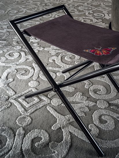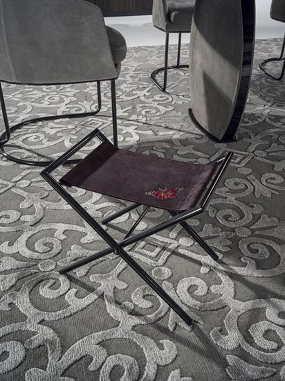 可收合包包摆放架,钢结构的饰面可选:亮光渐变棕、黑玫瑰金、亮光浅金、哑光香槟金、亮光镀铬、亮光镀黑铬、哑光缎面青铜、亮光玫瑰金、哑光玫瑰金。摆放包包的撑带部分为P.3类Suede皮料,可选有或无刺绣的版本。是一件通用的家具元素,可摆放在家中任何角落,或餐桌或床的附近,当作实用的摆放物品元素。