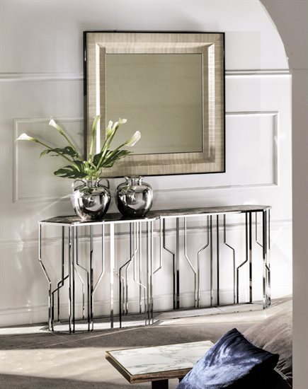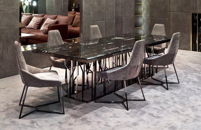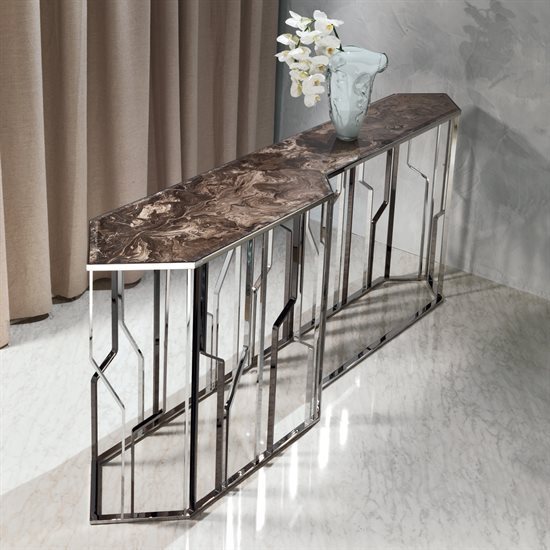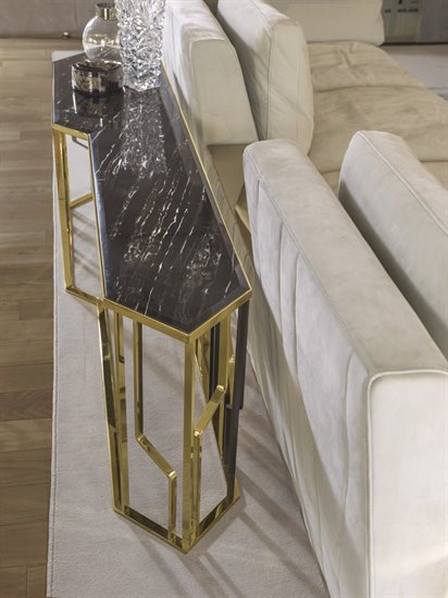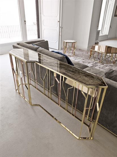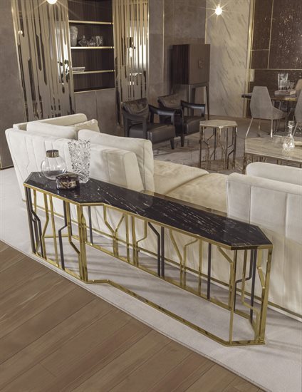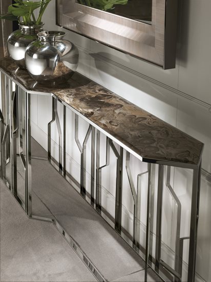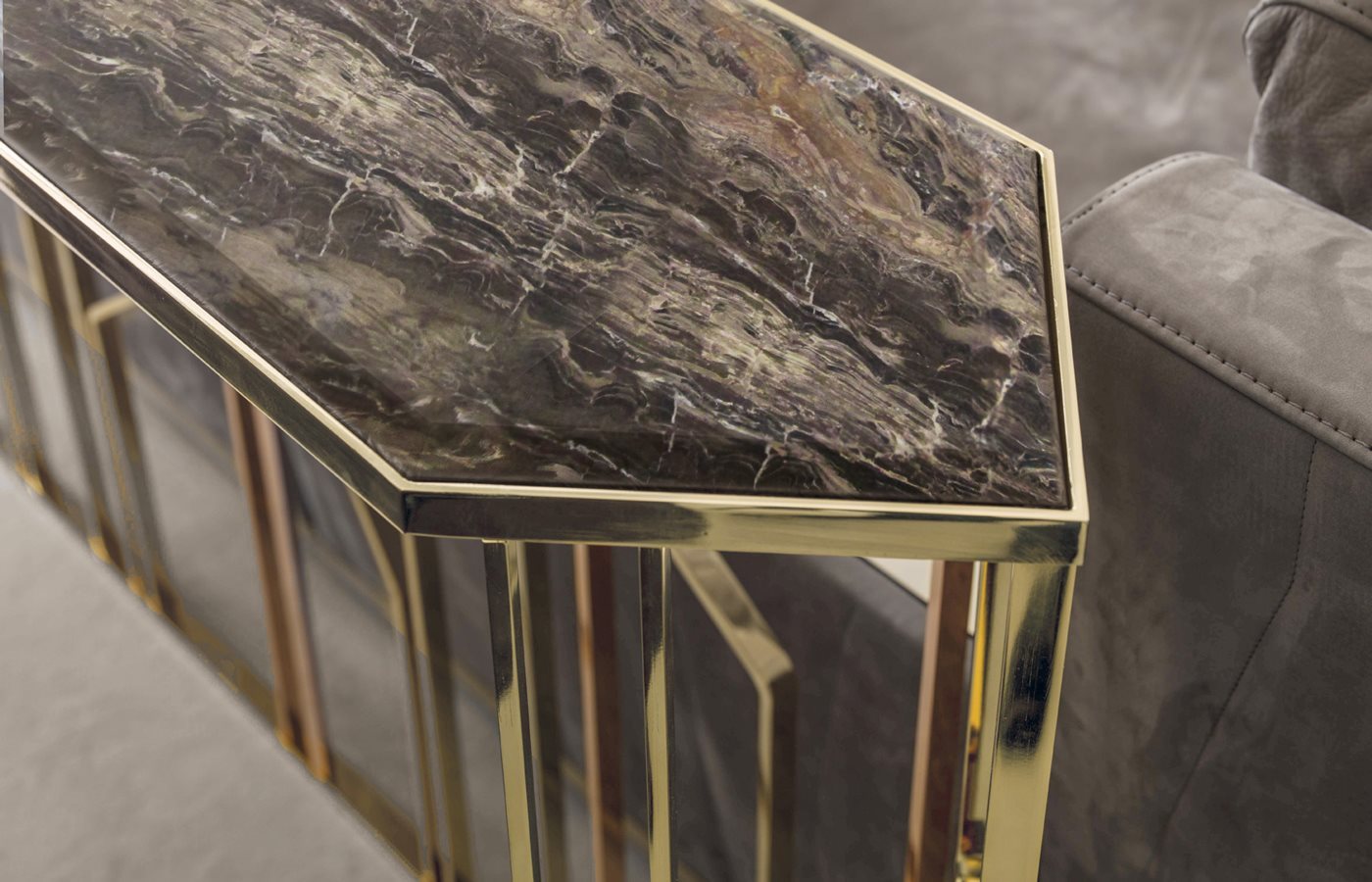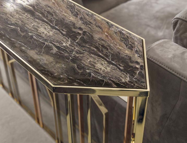 金属底座,可选以下饰面:亮光浅金、亮光渐变棕、哑光香槟金、亮光玫瑰金、亮光镀铬、亮光镀黑铬、哑光缎面青铜;双色版本包括:亮光浅金或亮光渐变棕搭配亮光玫瑰金、亮光镀铬搭配亮光镀黑铬、亮光浅金或亮光渐变棕搭配亮光镀黑铬、亮光浅金或亮光渐变棕搭配哑光缎面青铜。台面可选:厚度20mm磨斜边20mm大理石:Elegant Brown大理石、Palissandro Oniciato大理石、Emperador Dark大理石、Silver Wave大理石、Port Black大理石、Frappuccino大理石、Calacatta Gold大理石、蜜色缟玛瑙(依要求定制)。磨斜边镜面,颜色可选:玫瑰色、青铜色、烟熏色。覆面皮料依样本挑選。