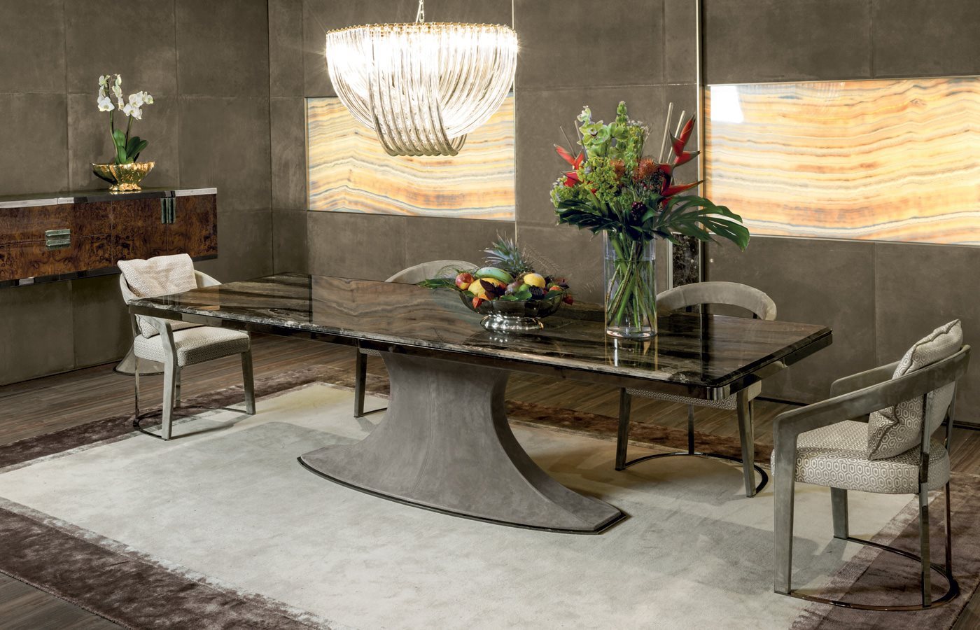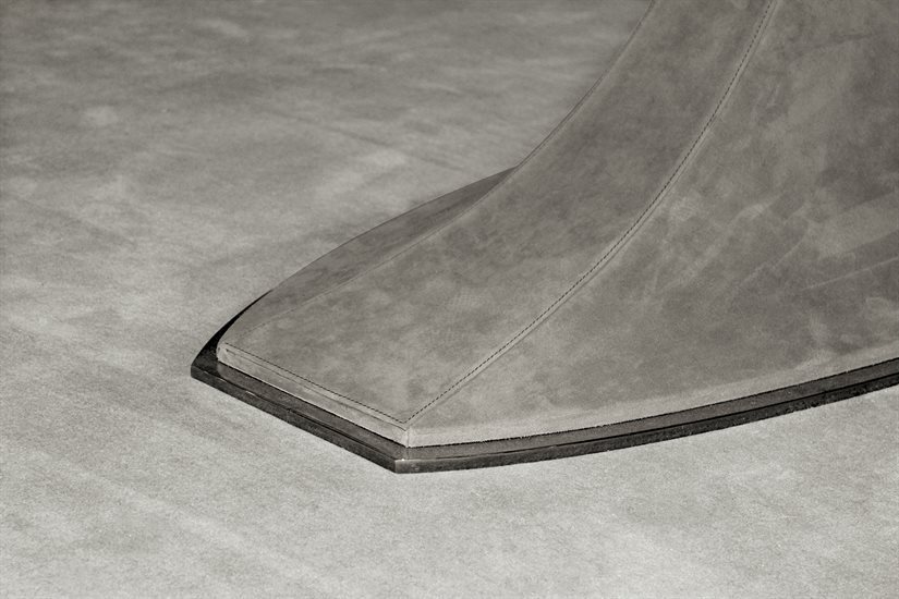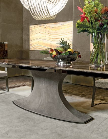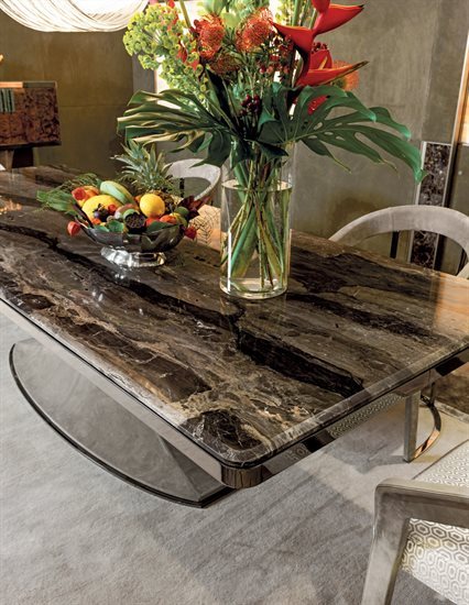 餐桌,玻璃纤维底座,内侧结构采用涂漆金属制成,覆面皮料依样本挑选。底座金属板以及桌面金属边框的饰面可选:黑玫瑰金、亮光浅金、亮光渐变棕、哑光香槟金、亮光镀铬、亮光镀黑铬、哑光缎面青铜、亮光玫瑰金、哑光玫瑰金。台面可选:磨斜边黑色涂漆10mm水晶、磨斜边青铜色或烟熏色5mm镜面、厚度20mm带磨斜边20mm大理石:Fusion Light大理石、Patagonia大理石、Explosion Blu大理石、Fusion Multicolor大理石、Quarzo Juliet大理石、Sahara Noir大理石(聚酯面漆)、Dover White大理石、Panda White大理石、Verde Guatemala大理石、Corteccia大理石、Port Saint Laurent大理石、Rosso Levanto大理石、Bardiglio Nuvolato大理石、Elegant Brown大理石、Palissandro Oniciato大理石、Emperador Dark大理石、Silver Wave大理石、Agatha Black大理石、Frappuccino大理石、Calacatta Gold大理石。