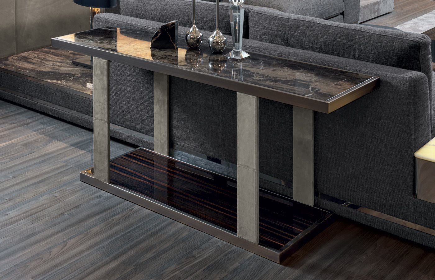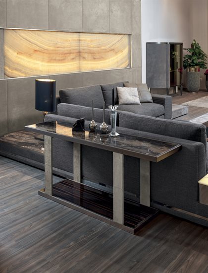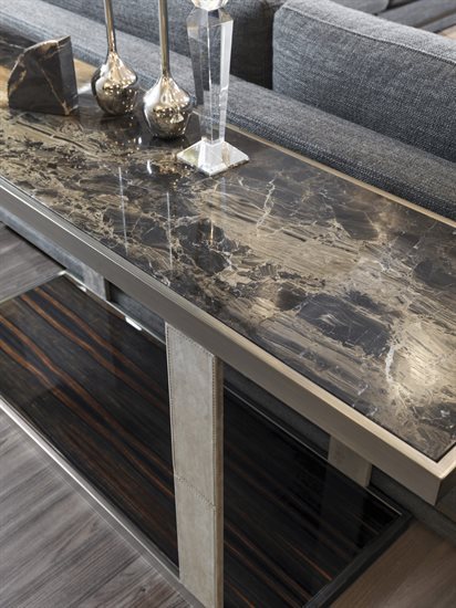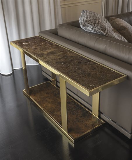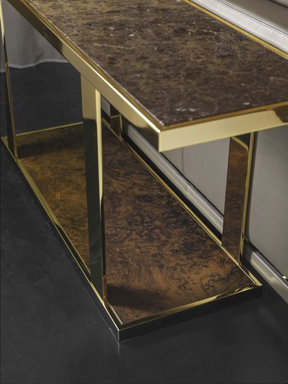 玄关桌带金属结构,金属饰面可选:黑玫瑰金、亮光浅金、亮光渐变棕、哑光香槟金、亮光镀铬、亮光镀黑铬、哑光缎面青铜、亮光玫瑰金、哑光玫瑰金。台面可选:青铜色或烟熏色镜面,Azul Macauba大理石、Portoro大理石、Sahara Noir大理石(聚酯面漆)、Dover White大理石、Panda White大理石、Verde Guatemala大理石、Corteccia大理石、Port Saint Laurent大理石、Rosso Levanto大理石、Bardiglio Nuvolato大理石、Elegant Brown大理石、Palissandro Oniciato大理石、Emperador Dark大理石、Silver Wave大理石、Agatha Black大理石、Frappuccino大理石、Calacatta Gold大理石、Fusion Light大理石、Patagonia大理石、Explosion Blu大理石、Fusion Multicolor大理石、Quarzo Juliet大理石、Calcite Azul大理石。底座:亮光∕哑光黑檀木、亮光∕哑光卡纳莱托核桃木、亮光∕哑光西克莫槭木、亮光胡桃木树榴、皮料覆面(依样本挑選)。支柱的饰面与结构相同,或皮料覆面。