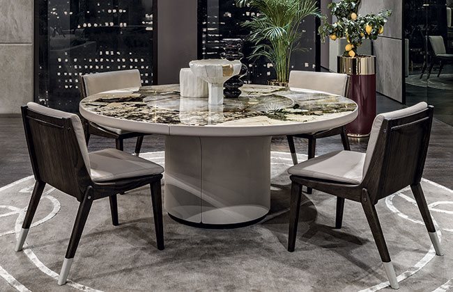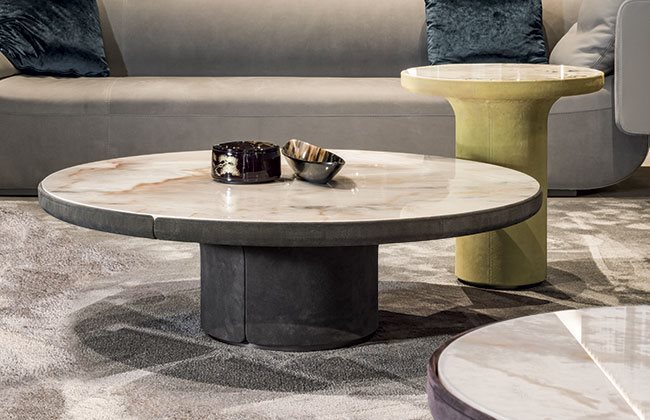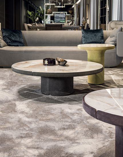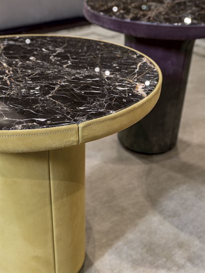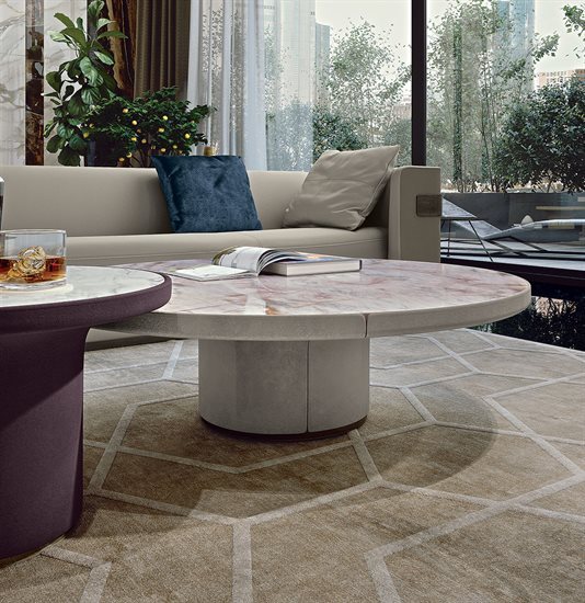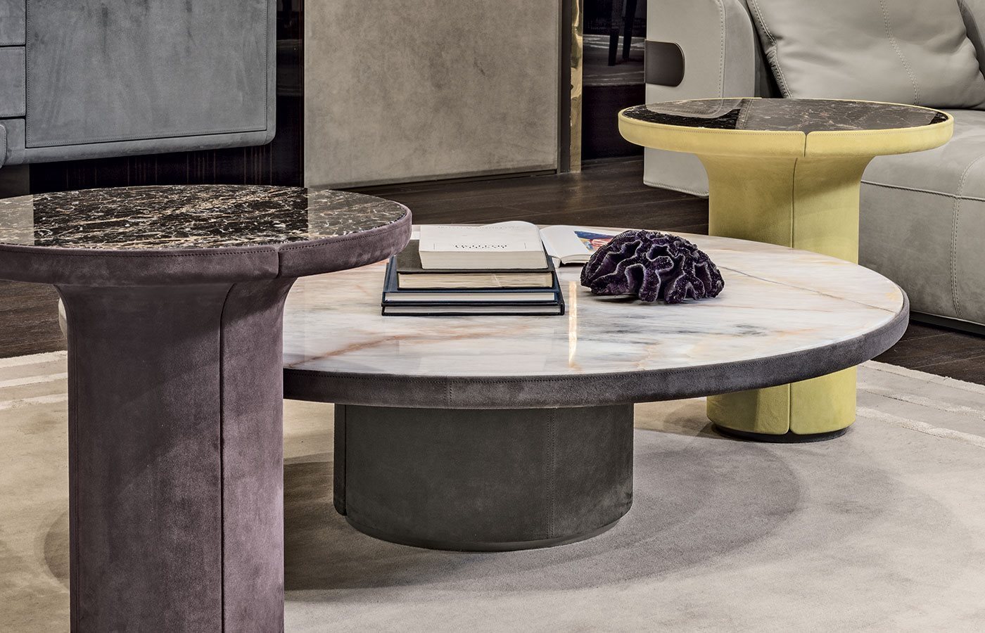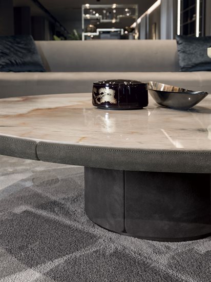 圆形茶几,内部结构采用涂漆金属制成,结构壳体则为手工模压玻璃纤维制成,覆面皮料依样本挑選。底座的金属边框采用磨削工艺制成,饰面可选:亮光浅金、亮光渐变棕、哑光香槟金、亮光镀铬、亮光镀黑铬、哑光缎面青铜、亮光玫瑰金、哑光玫瑰金、黑玫瑰金。台面可选:- 青铜色或烟熏色镜面;- 大理石:Azul Macauba、Calcite Azul、Fusion Light、Patagonia、Explosion Blu、Fusion Multicolor、Quarzo Juliet、Sahara Noir(聚酯面漆)、Dover White、Panda White、Verde Guatemala、Corteccia、Port Saint Laurent、Rosso Levanto、Bardiglio Nuvolato、Elegant Brown、Palissandro Oniciato、Emperador Dark、Silver Wave、Agatha Black、Frappuccino、Calacatta Gold;- 木材「瓣状」镶嵌加工,木质可选:西克莫槭木、亮光黑檀木、亮光卡纳莱托核桃木。