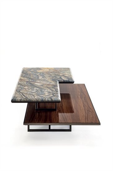 一系列不同尺寸与饰面的茶几,以重叠不同高度,几乎产生悬浮效果的平台展现特色。 下方矮茶几的部分带3格抽屉与底座,侧边与台面的木质可选:亮光烤漆(颜色依样本挑選)、亮光黑檀木、亮光卡纳莱托核桃木、亮光西克莫槭木、亮光胡桃木树榴。抽屉正面面板的覆面皮料依样本挑選。搁板可选饰面:磨斜边青铜色或烟熏色镜面;带磨斜边20mm大理石:Portoro大理石、Azul Macauba大理石、Sahara Noir大理石(聚酯面漆)、Dover White大理石、Panda White大理石、Verde Guatemala大理石、Corteccia大理石、Port Saint Laurent大理石、Rosso Levanto大理石、Bardiglio Nuvolato大理石、Elegant Brown大理石、Palissandro Oniciato大理石、Emperador Dark大理石、Silver Wave大理石、Agatha Black大理石、Frappuccino大理石、Calacatta Gold大理石、Fusion Light大理石、Patagonia大理石、Explosion Blu大理石、Fusion Multicolor大理石、Quarzo Juliet大理石、Calcite Azul大理石。