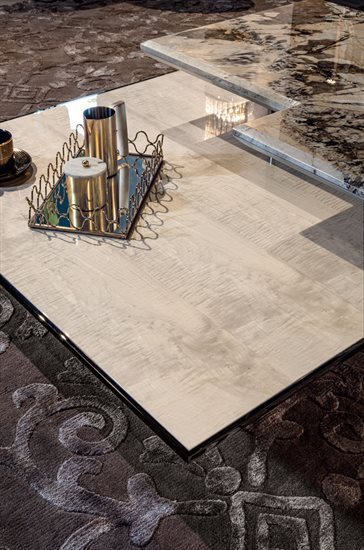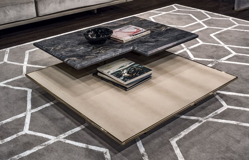 方形或长方形茶几带金属支撑底座与台面下边框,金属部分采用磨削工艺制成,饰面可选:亮光浅金、亮光渐变棕、哑光香槟金、亮光镀铬、亮光镀黑铬、哑光缎面青铜、亮光玫瑰金、哑光玫瑰金、黑玫瑰金。下方木质台面,木质可选:亮光黑檀木、亮光卡纳莱托核桃木、亮光西克莫槭木、亮光胡桃木树榴,或经过特殊防污处理的P.18类皮料。搁板可选饰面:磨斜边青铜色或烟熏色镜面;带磨斜边20mm大理石:Portoro大理石、Azul Macauba大理石、Sahara Noir大理石(聚酯面漆)、Dover White大理石、Panda White大理石、Verde Guatemala大理石、Corteccia大理石、Port Saint Laurent大理石、Rosso Levanto大理石、Bardiglio Nuvolato大理石、Elegant Brown大理石、Palissandro Oniciato大理石、Emperador Dark大理石、Silver Wave大理石、Agatha Black大理石、Frappuccino大理石、Calacatta Gold大理石、Fusion Light大理石、Patagonia大理石、Explosion Blu大理石、Fusion Multicolor大理石、Quarzo Juliet大理石、Calcite Azul大理石。