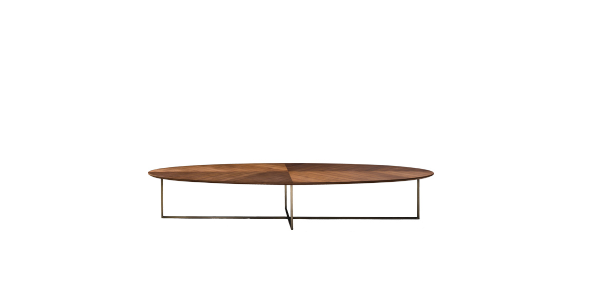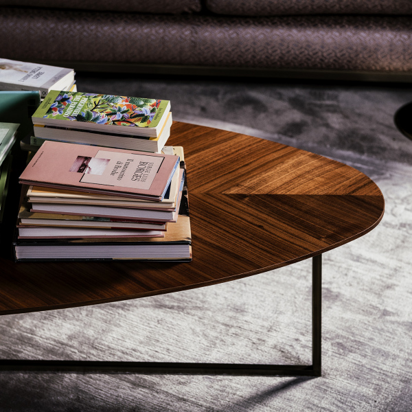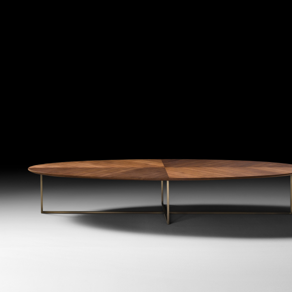 咖啡桌具有椭圆形和哑光深青铜色饰面。顶部是在卡纳莱托核桃。线,清洁和电流,是惊人的厚度减少,仍然揭示了材料的固体没有平等。空间使用演变,外观最小,但优雅。意大利设计擅长于寻找一个家具现实,成为简单和横向的完美结合。