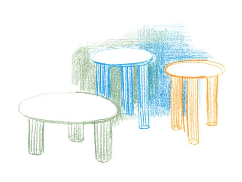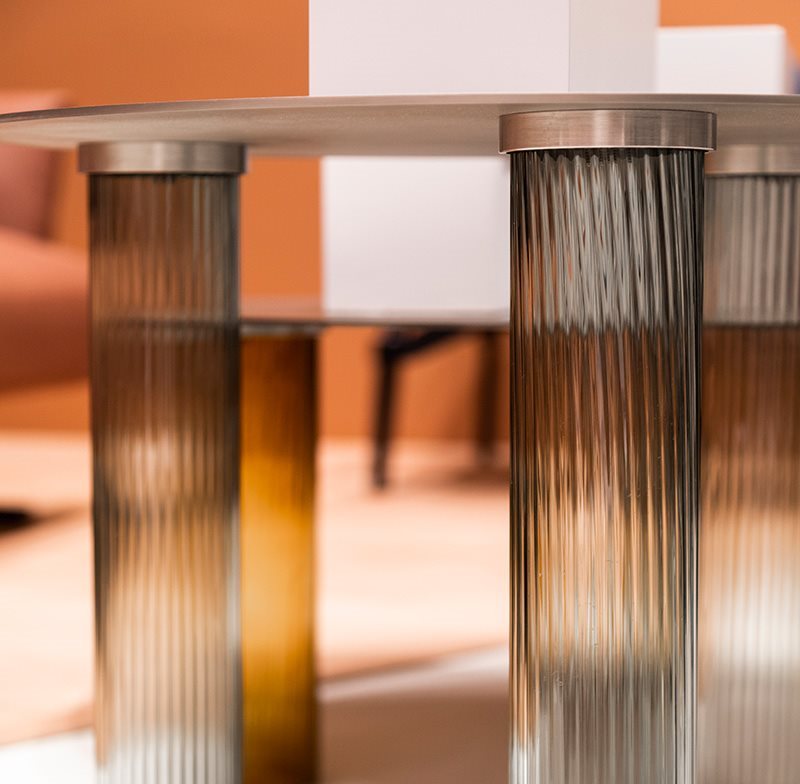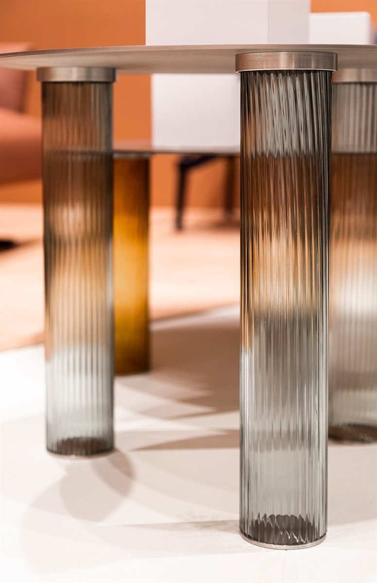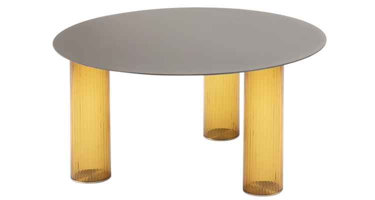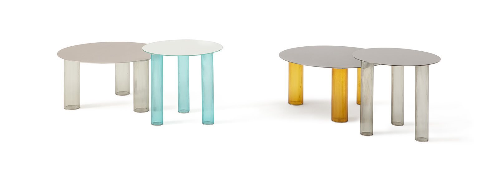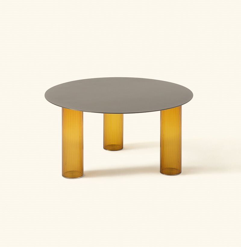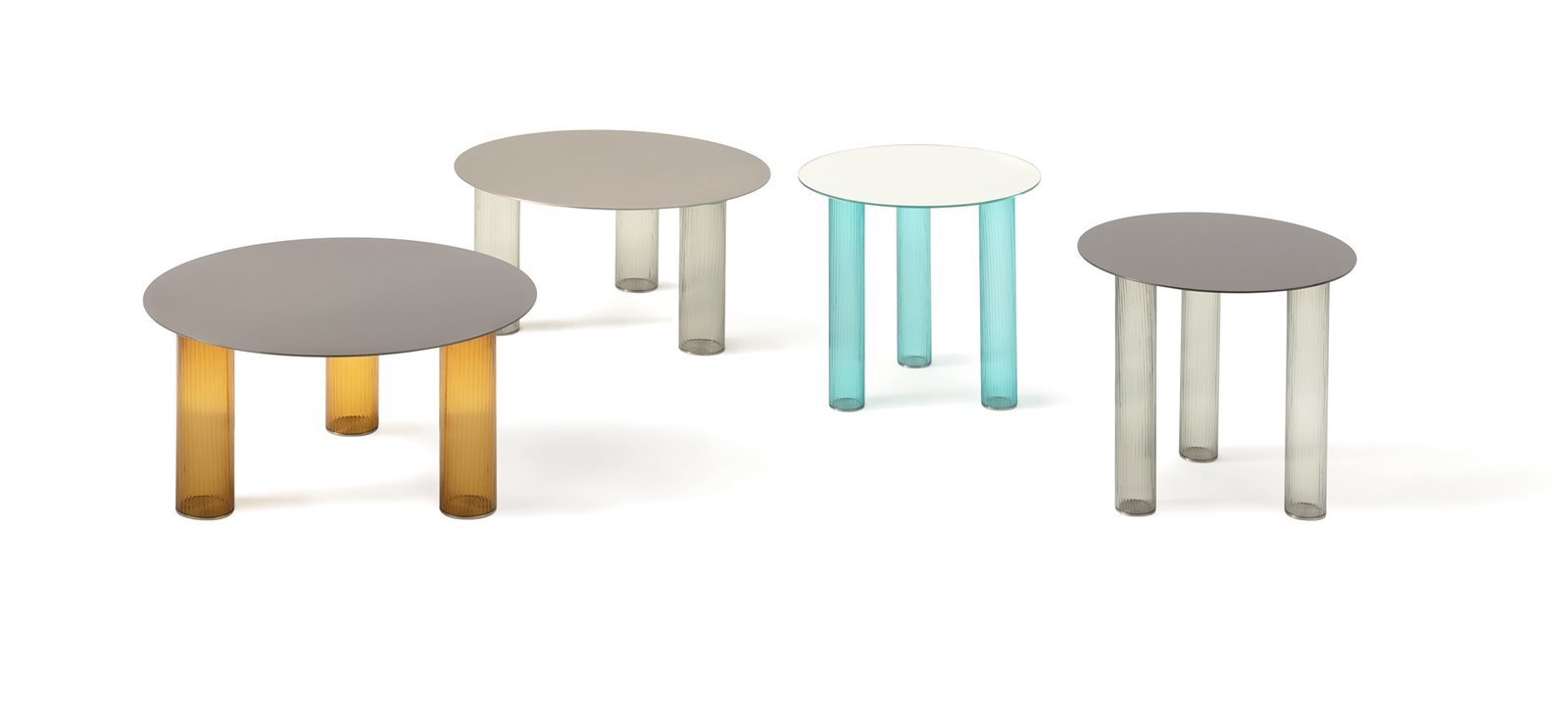 台几。 三层吹制玻璃支腿,有烟灰、浅蓝、琥珀色、蓝四款色调可选。 钢板台面,4毫米厚,本色或黑镍缎面工艺;镜面台面,5毫米厚。