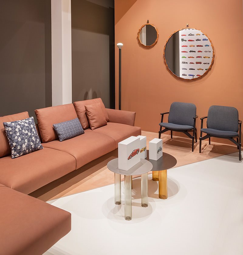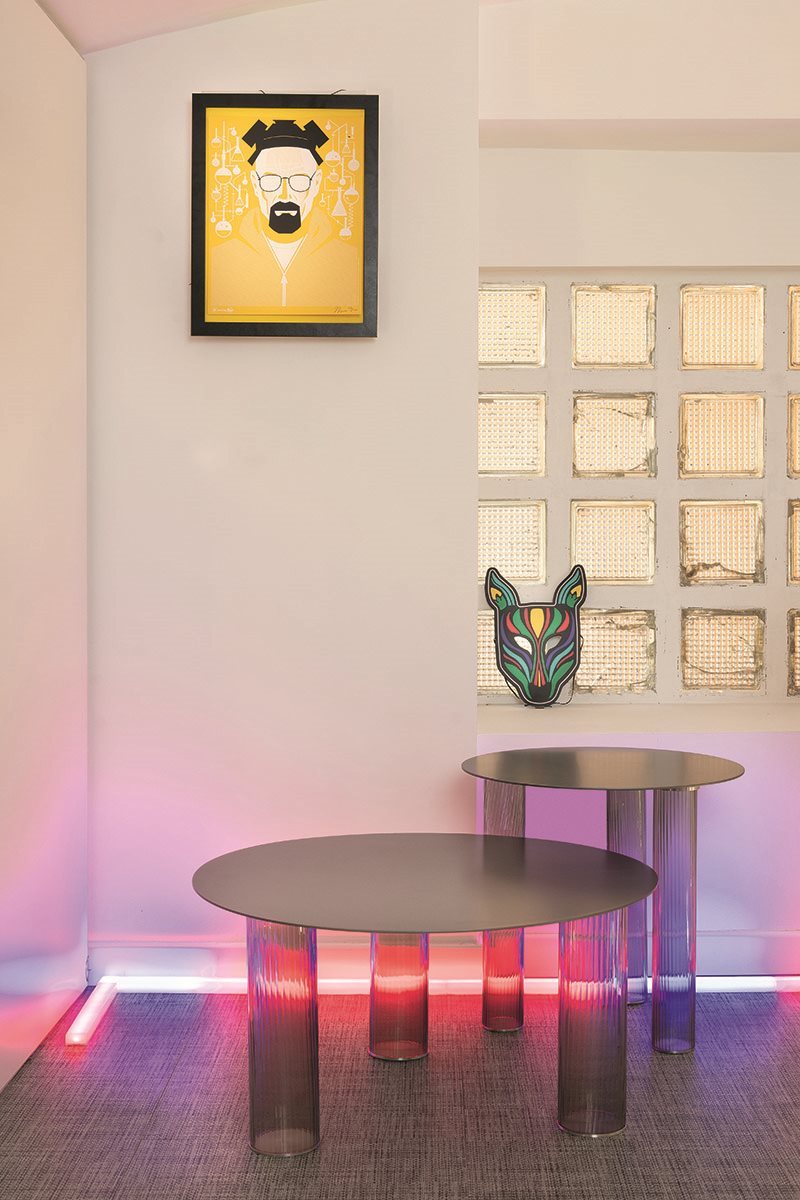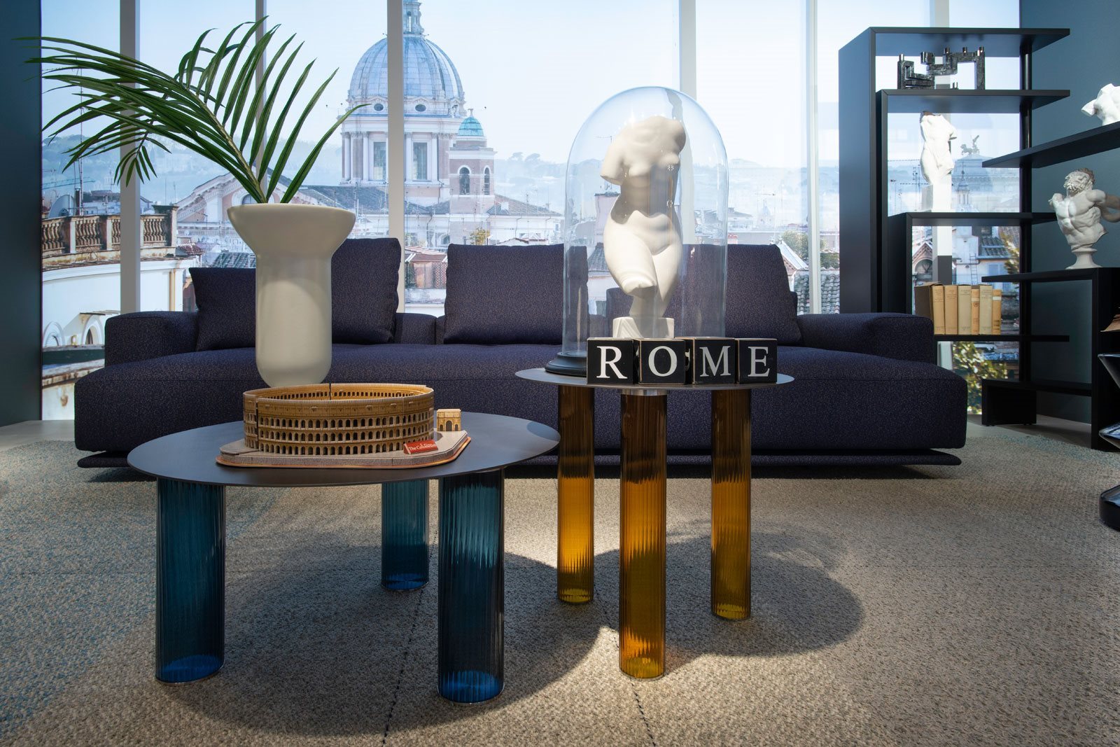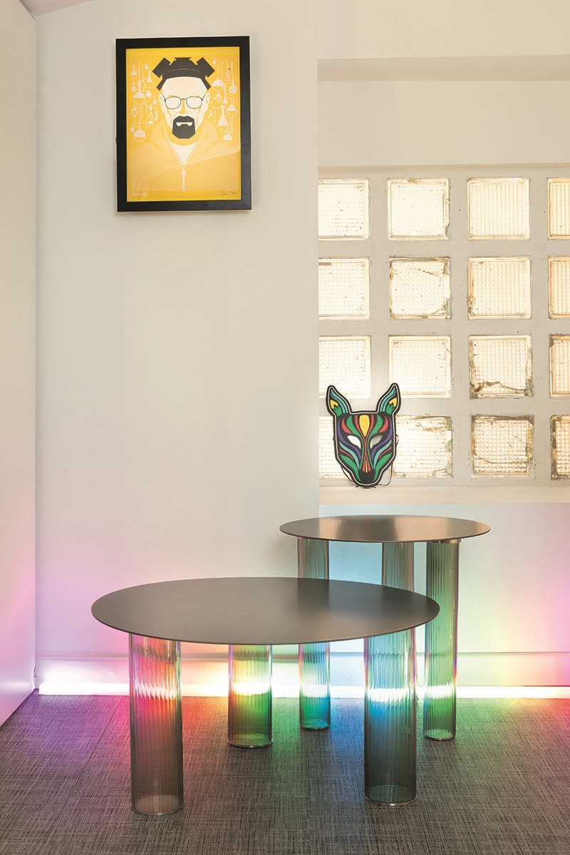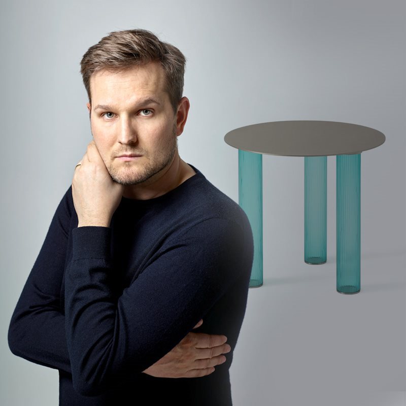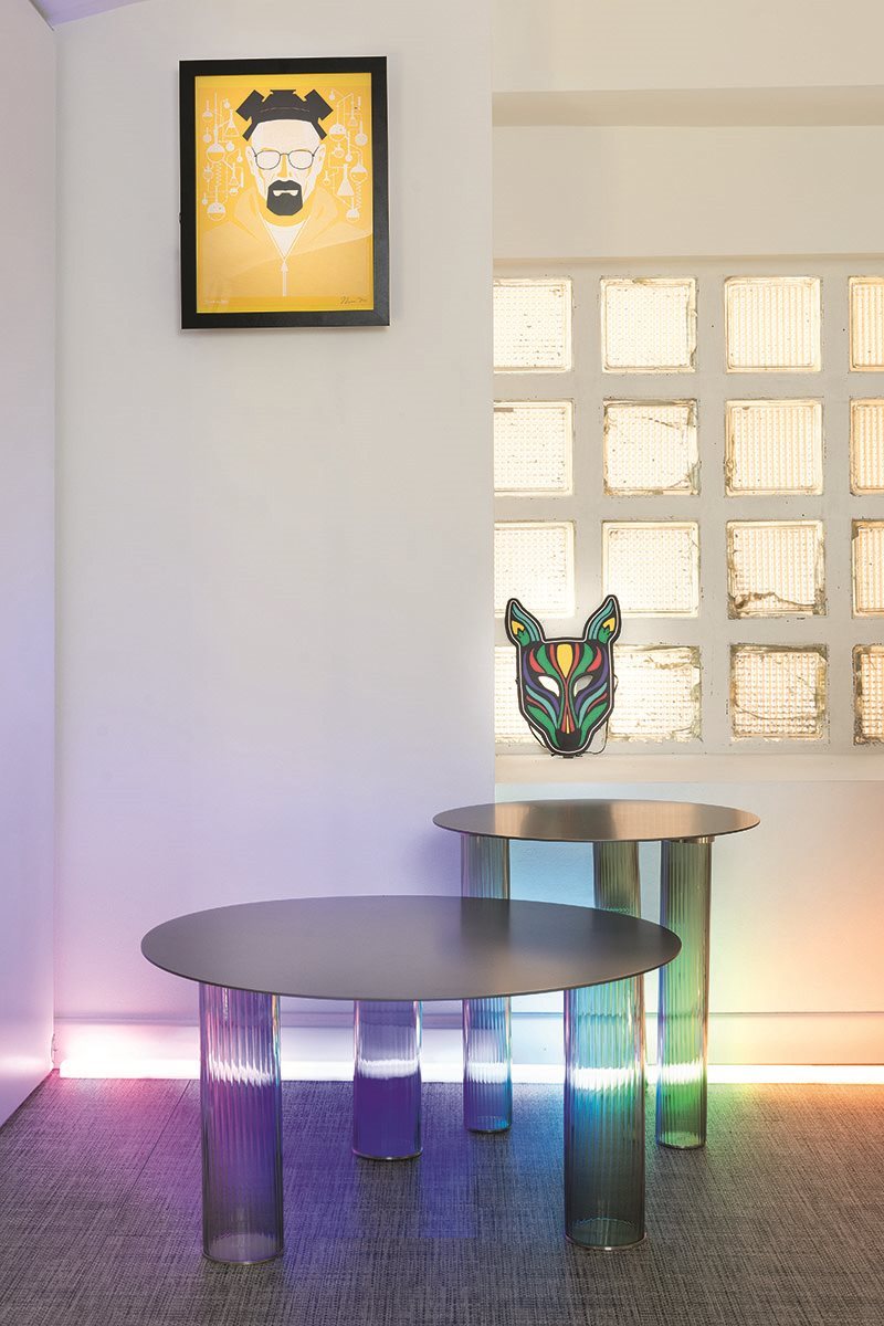 台几。 三层吹制玻璃支腿,有烟灰、浅蓝、琥珀色、蓝四款色调可选。 钢板台面,4毫米厚,本色或黑镍缎面工艺;镜面台面,5毫米厚。
