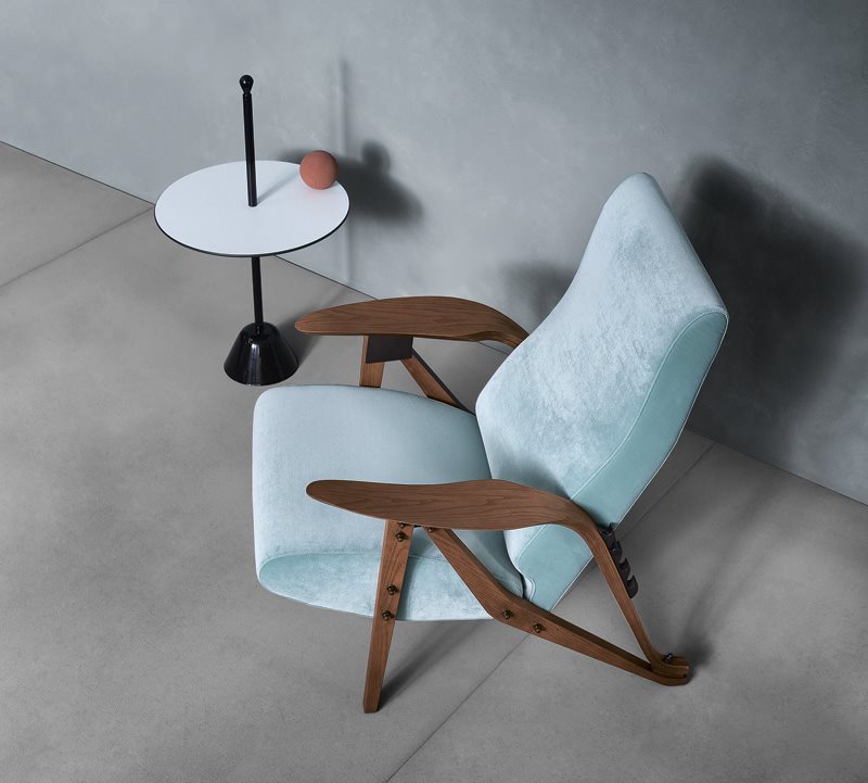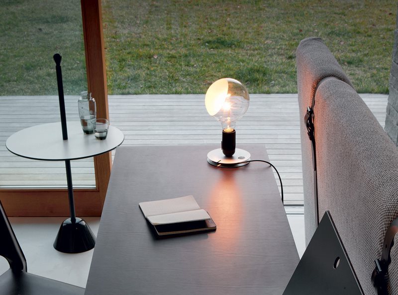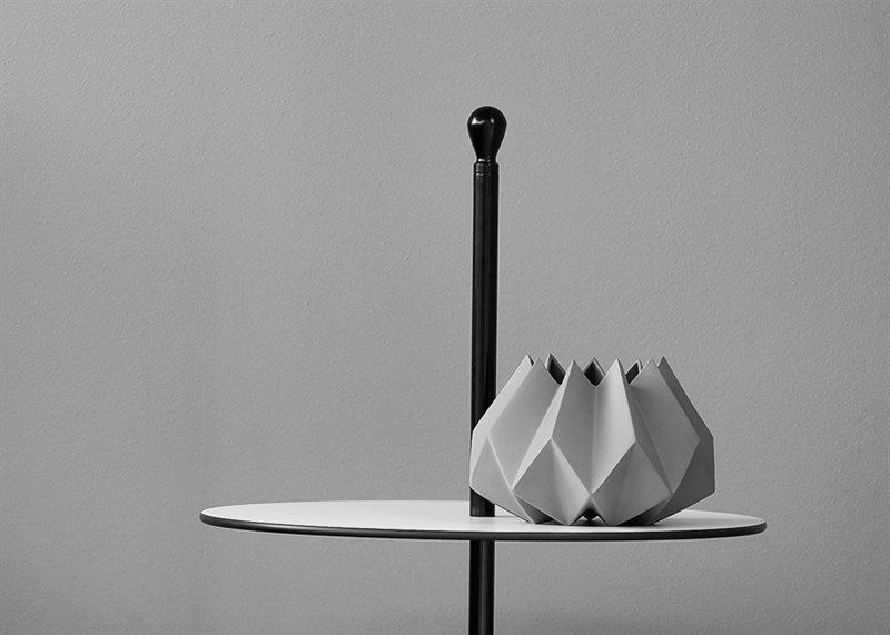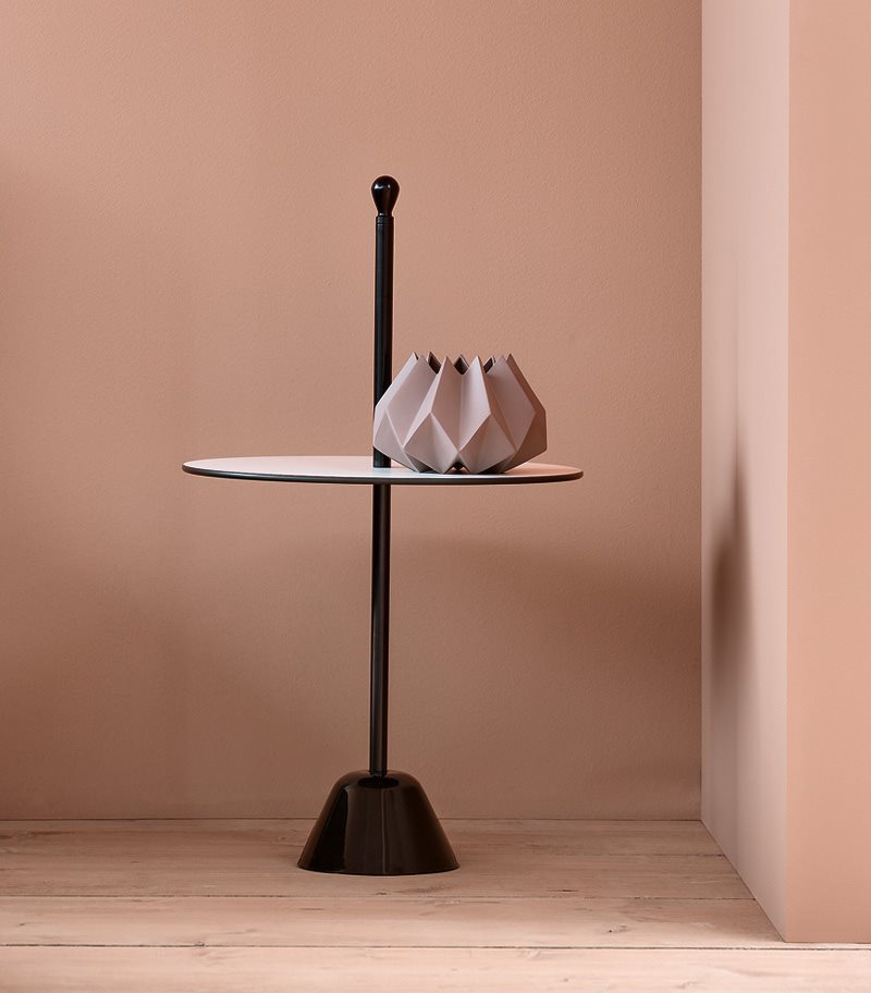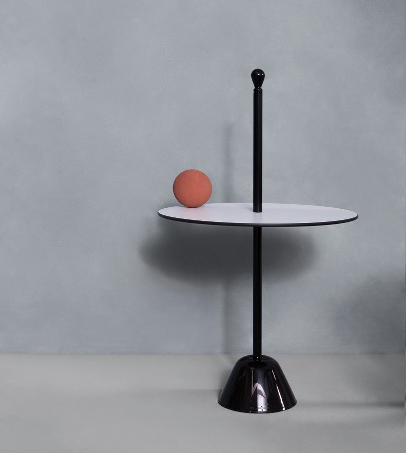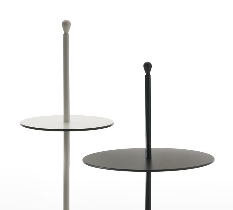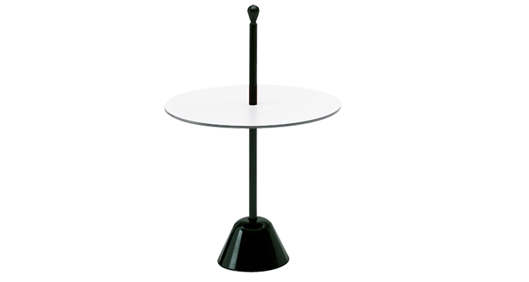 服务桌。聚丙烯底座搭配钢杆,有黑、白、紫红三款漆色。桌面覆以白/黑、紫红/灰、赤红/灰蓝塑料层压板。