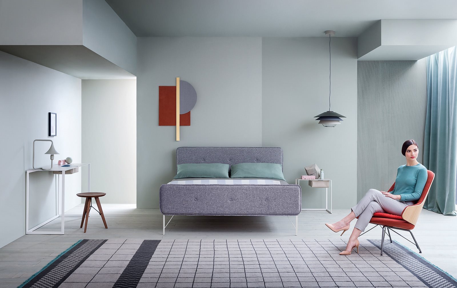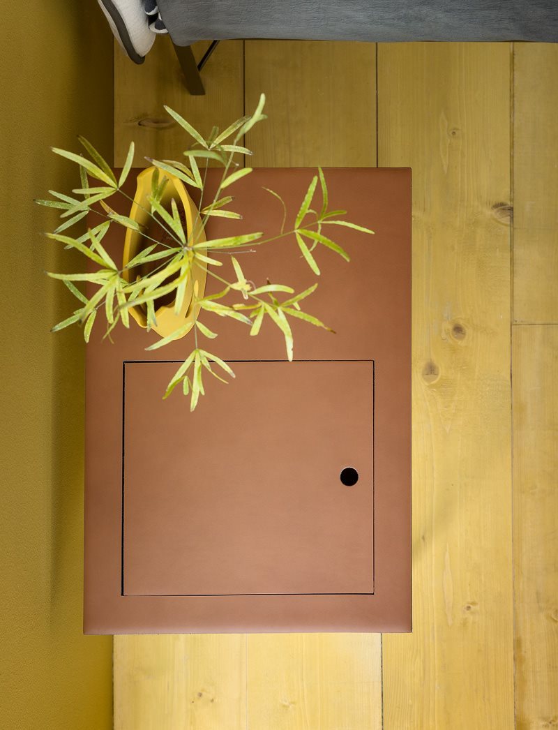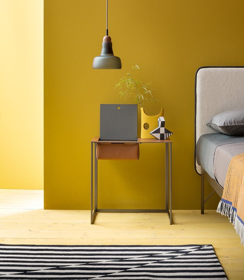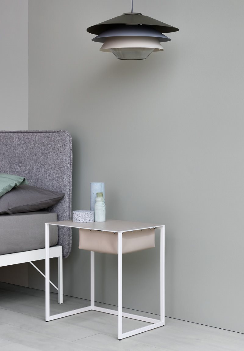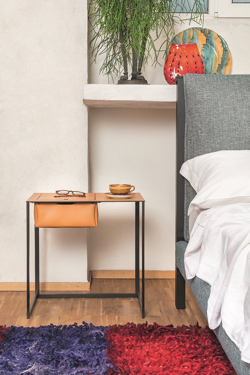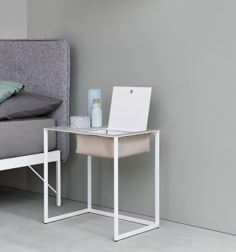 抽屉床头柜:钢质柜面和框架结构,有白、黑或石墨黑漆三款可选。柜面和收纳空间覆以90色号牛皮。收纳空间采用翻折开合设计。