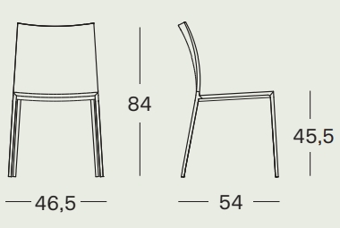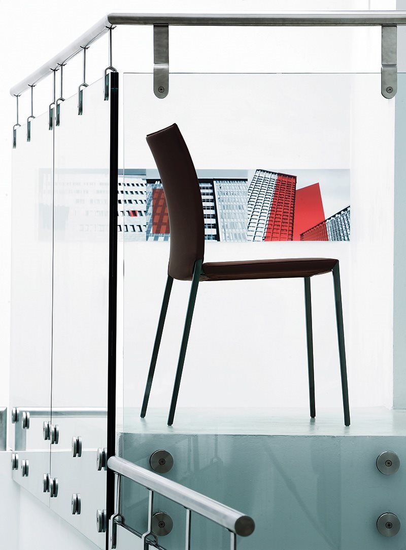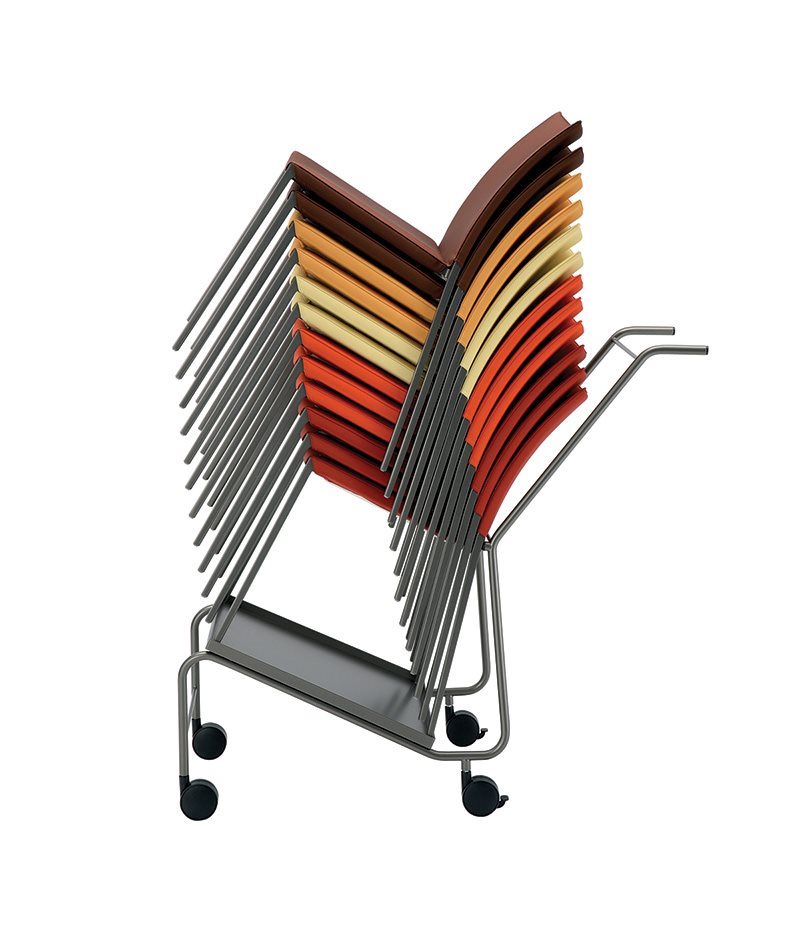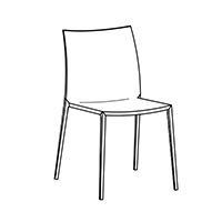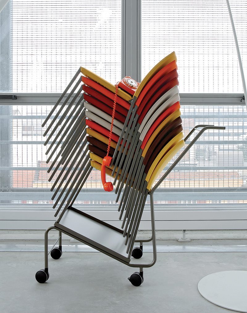 可堆叠椅子。 铝合金框架结构,抛光或喷漆,有黑、石墨黑、白三款色调。 椅座和靠背包覆聚氨酯衬垫。 布料或真皮护套可拆卸,牛皮护套不可拆卸。 可按需提供两个不固定护套:材质为纯白棉,短护套包覆椅座和靠背,长护套包覆椅腿。 按需提供搬运可堆叠椅子(最多15张椅子)的推车。