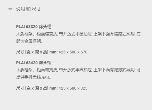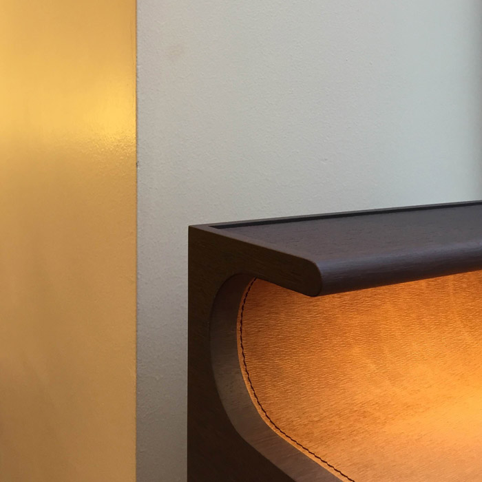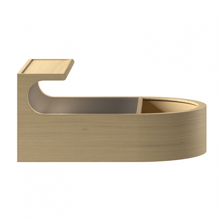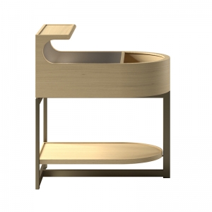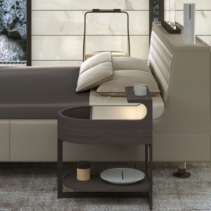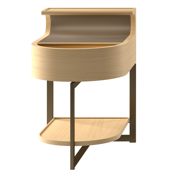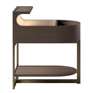 床头柜, 巴西龙凤檀木或橡木, 柜面镶真皮, 带半圆可旋转抽屉, 上架下面有隐藏LED照明, 底部为金属框架.