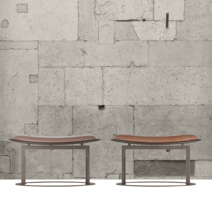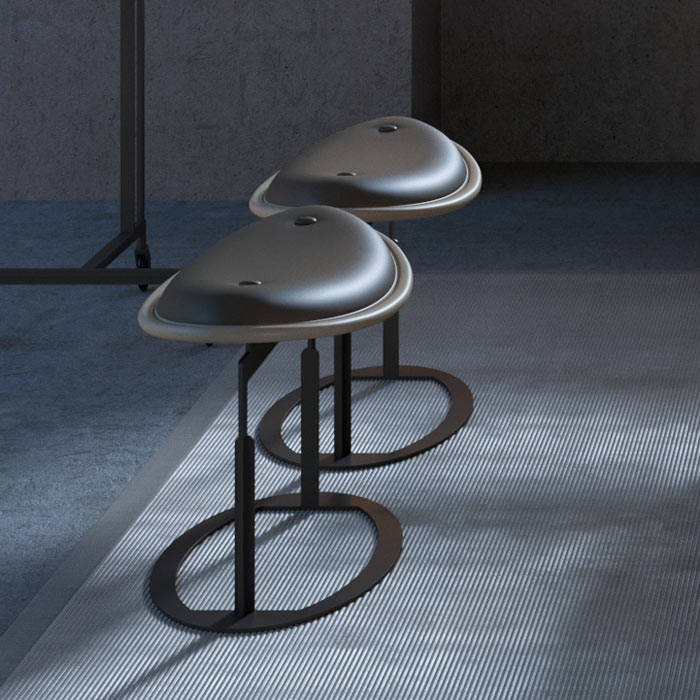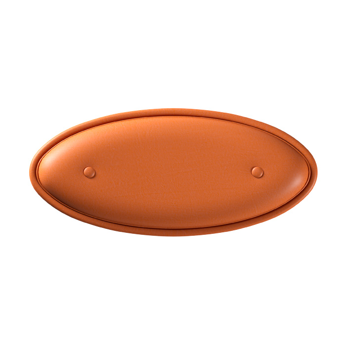 椭圆形凳子、织物或皮革软垫结构,以皮革边缘、金属底座支撑结束