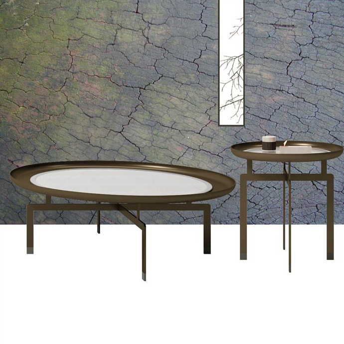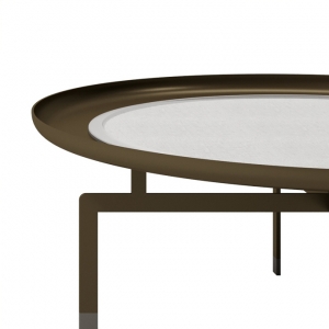 半透明织物或金属网夹层玻璃顶部,喷砂边缘和部分顶部,两个可拆卸皮革托盘下,金属结构。