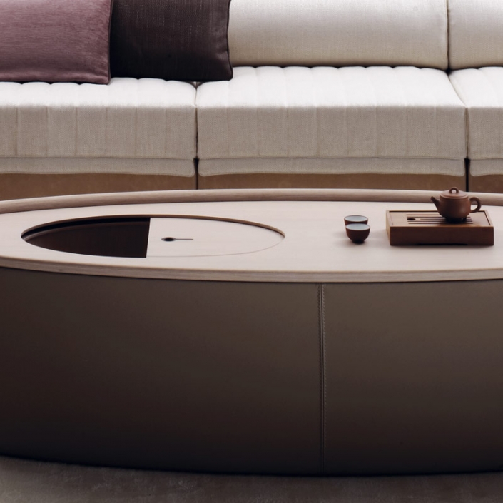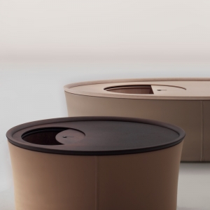 PNOI 56013 小椭圆形低桌在隐藏的滚筒基地在织物或皮革,顶部和凹陷柜在苏库皮拉或天然橡木。