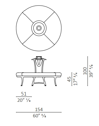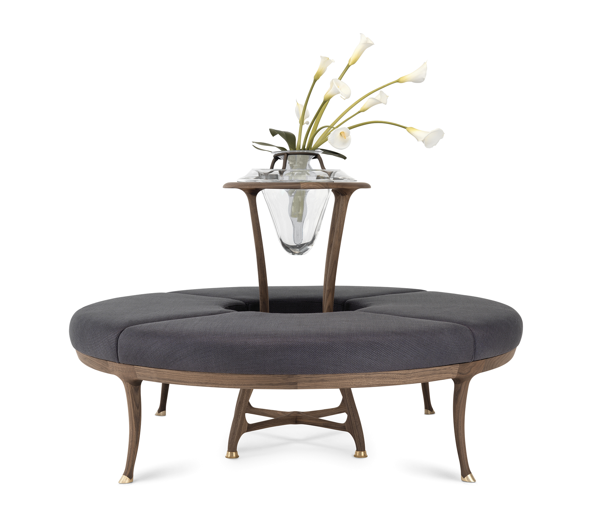 圆形沙发,由实心美国胡桃木制成,胶合板座椅,带衬垫的中央木制花瓶架,带抛光黄铜支架,透明吹制玻璃花瓶,抛光黄铜脚。