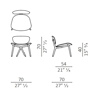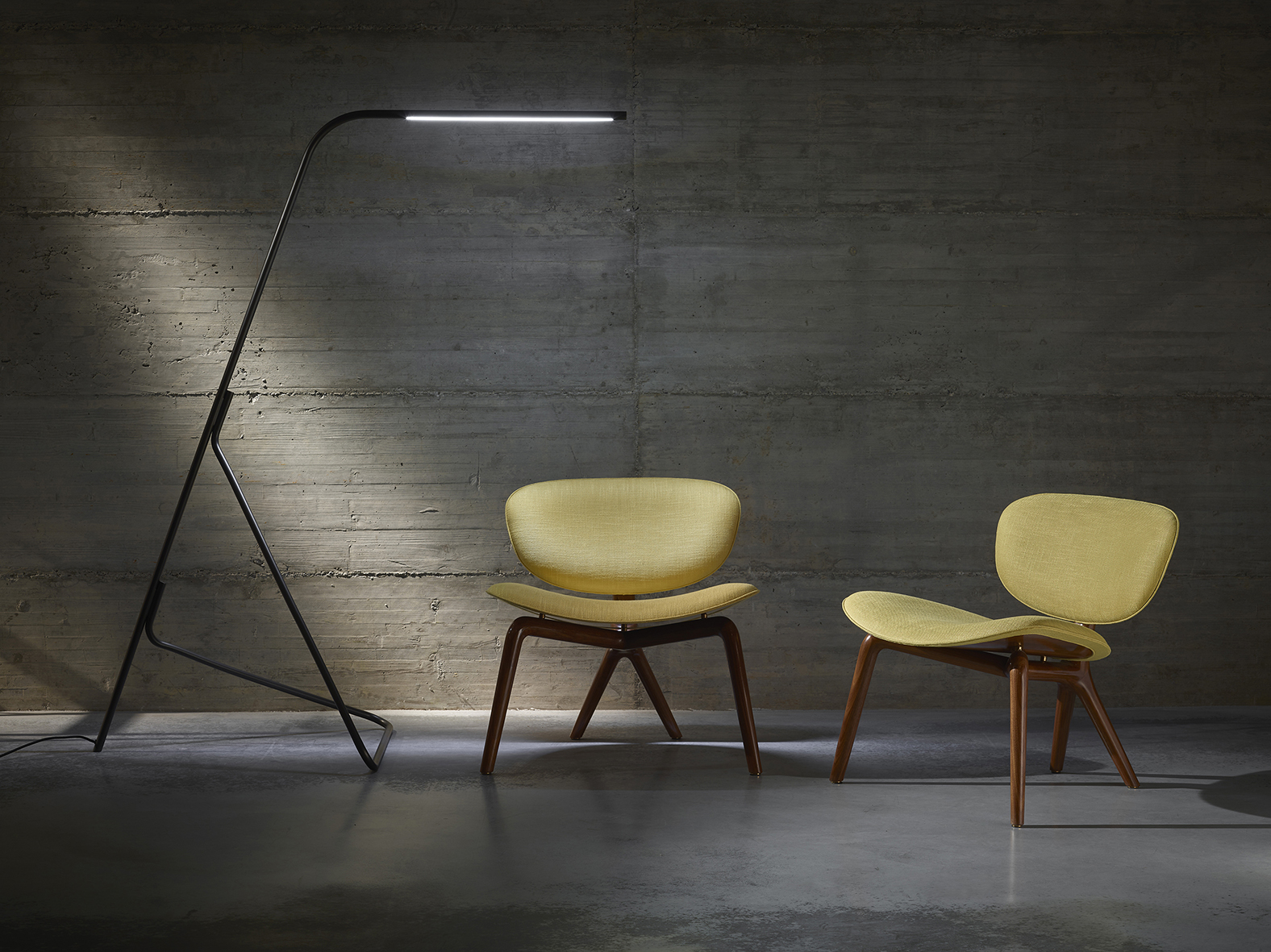 扶手椅由实心美国胡桃木制成,座椅和靠背采用弧形胶合板制成,带有软垫。