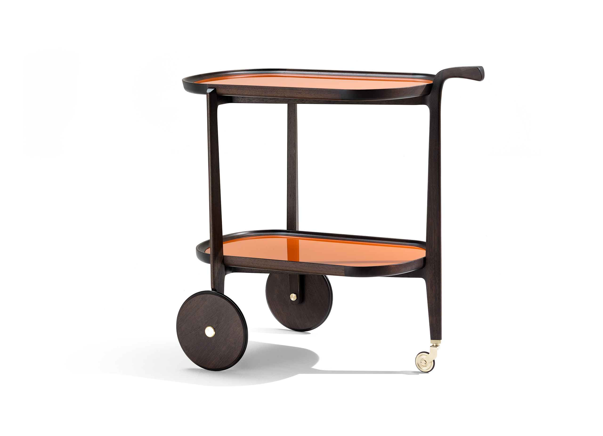 坚固的美国胡桃木手推车,带 1 个可拆卸托盘。带有木制或彩色玻璃顶部的托盘,黄铜机械师。