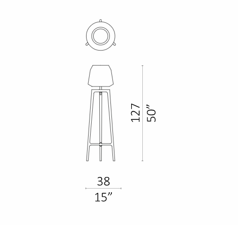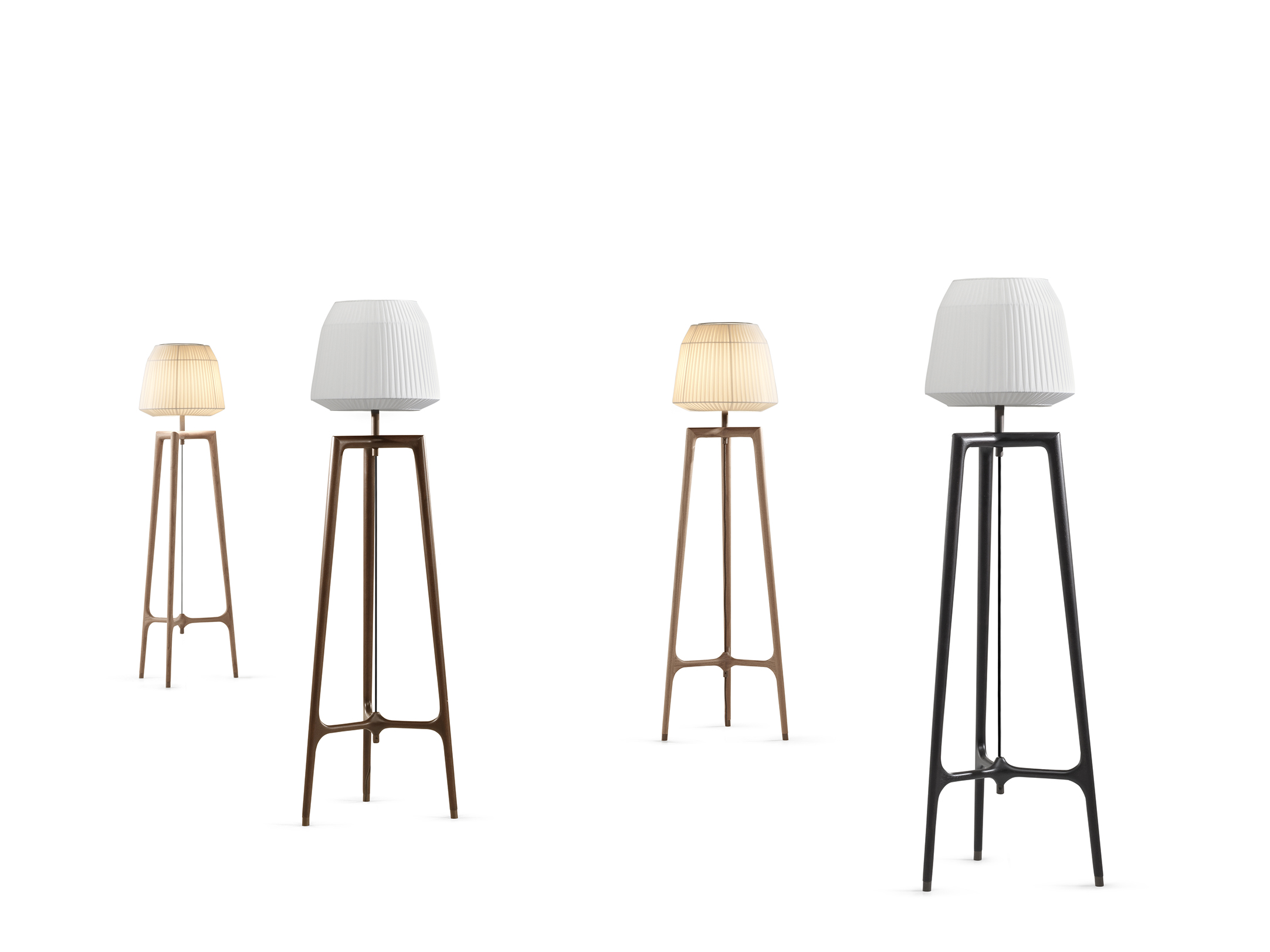 落地灯由实心美国胡桃木制成,灯罩为白色或奶油色织物,玻璃罩,脚为抛光黄铜。