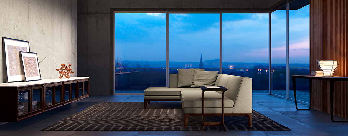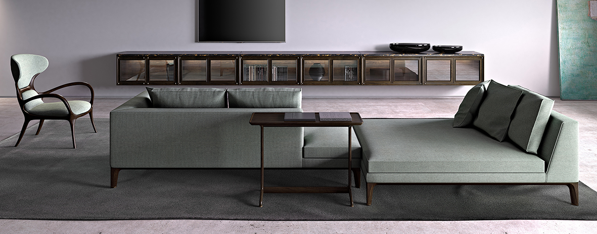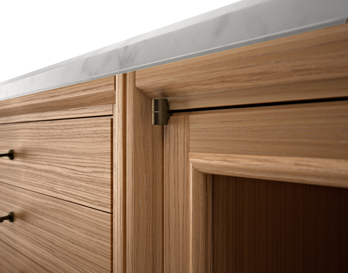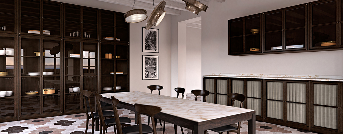 餐具柜采用实心美国胡桃木和贴面胶合板,4 毫米透明玻璃门,抛光黄铜硬件,1 个内部木架。(不包括地板)。用磁铁或 cremone 封闭。