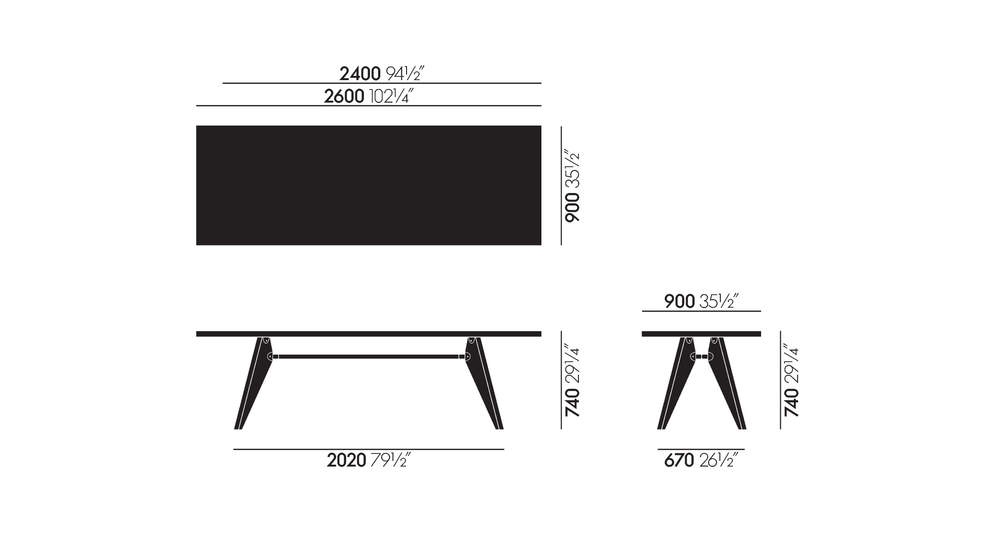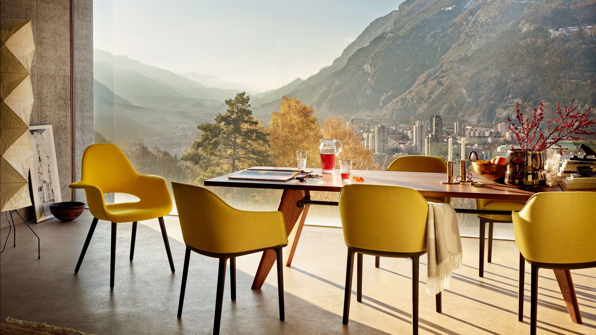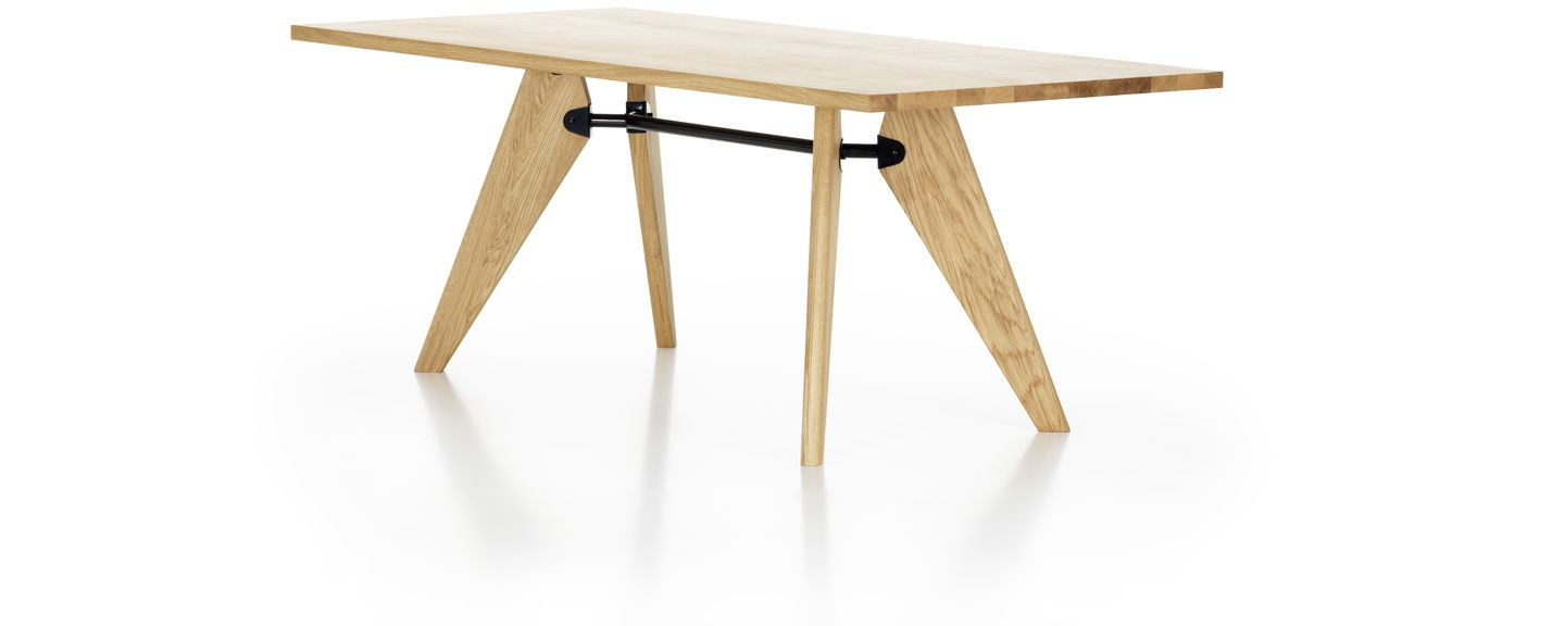 Jean Prouvé 在第二次世界大战期间开发了 Table Solvay,由于当时金属稀缺,他设计了这款带有木腿的优雅作品。可选择天然橡木、深色橡木或美国胡桃木的实木组件为餐桌增添了轻松和精致的感觉。