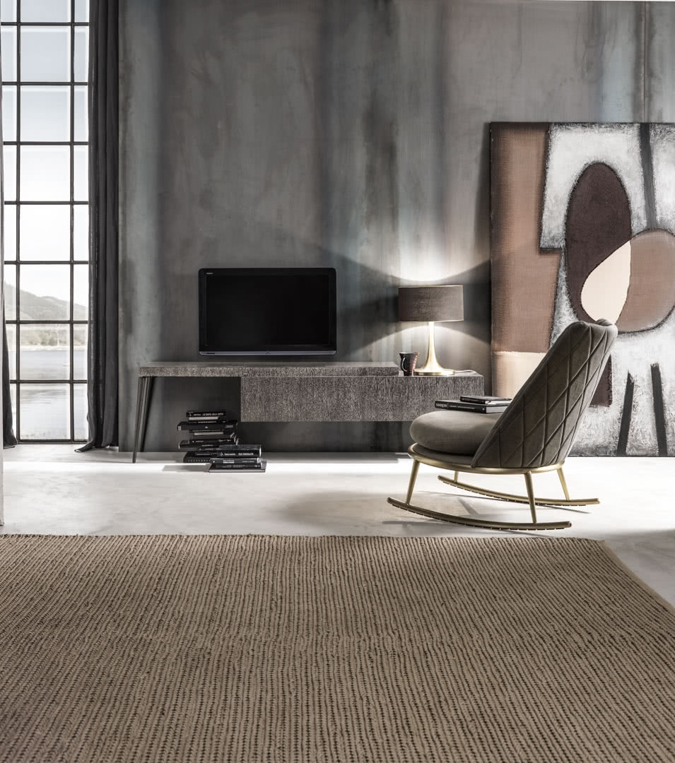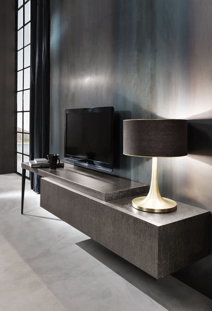 城市电视支架,奇异元素,要固定在墙上,宽度可变。 事实上,通过将脚踩在地面上的顶部部分,它可以从 147 厘米扩展到 240 厘米,形成两层不同的高度。除了支撑面外,电视支架还配有带皮瓣门的储物室。