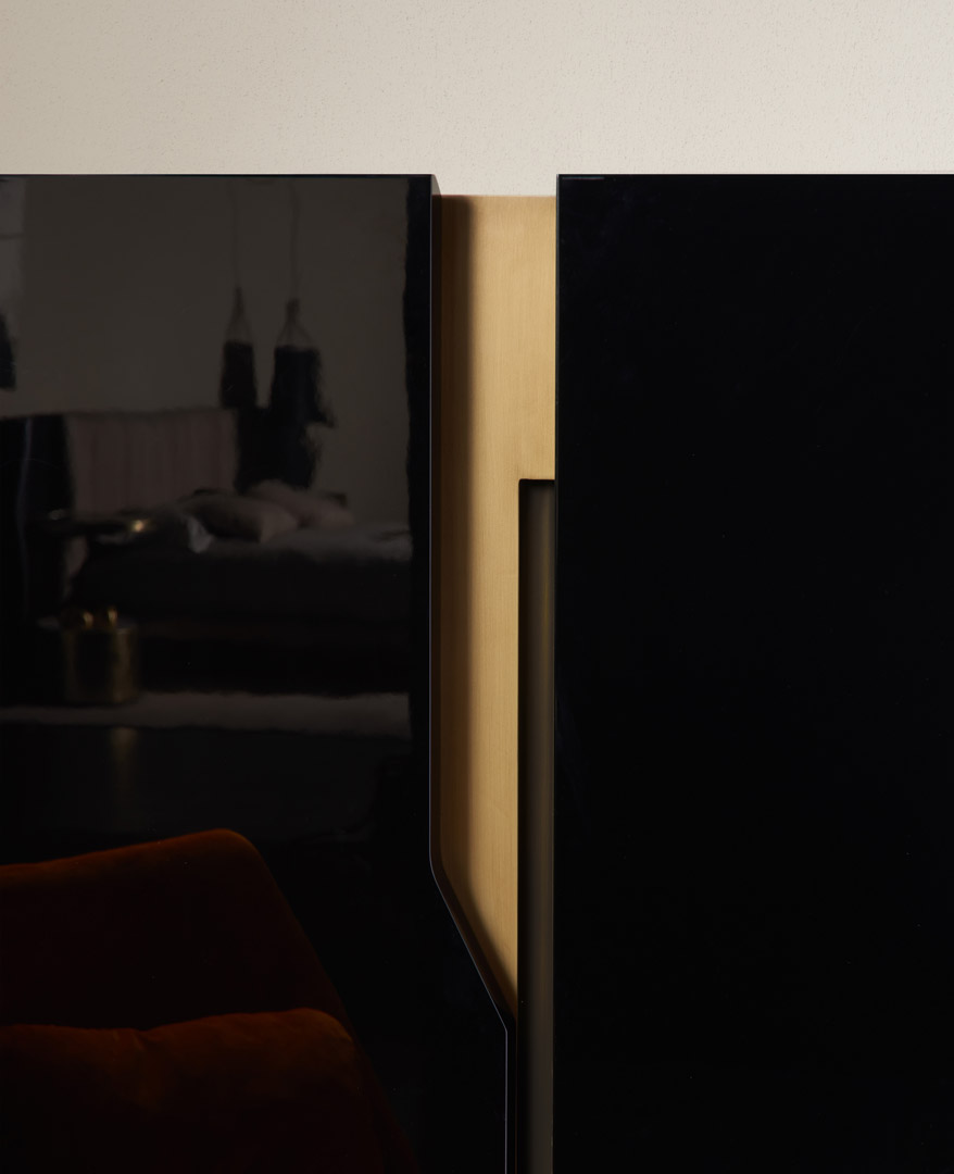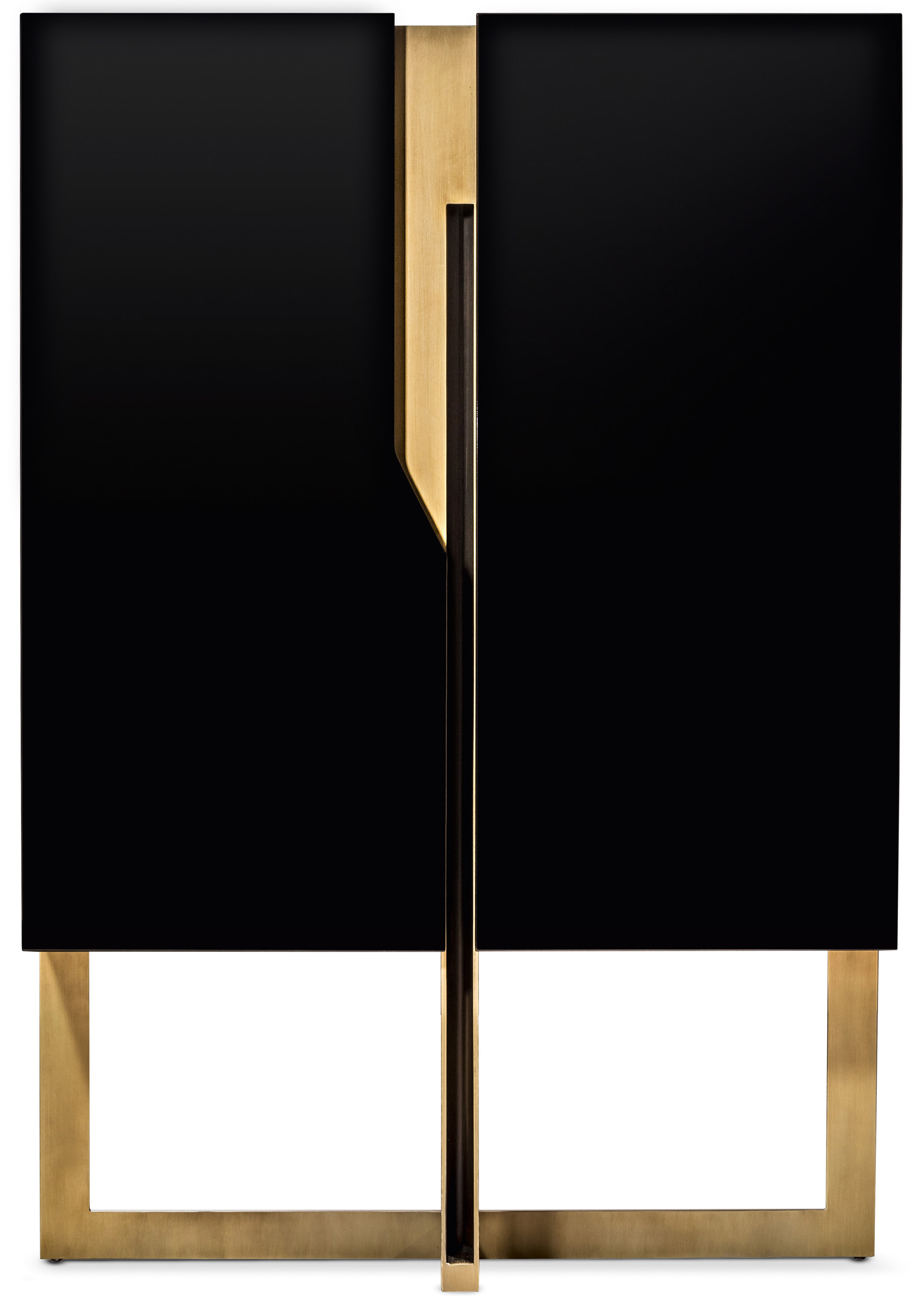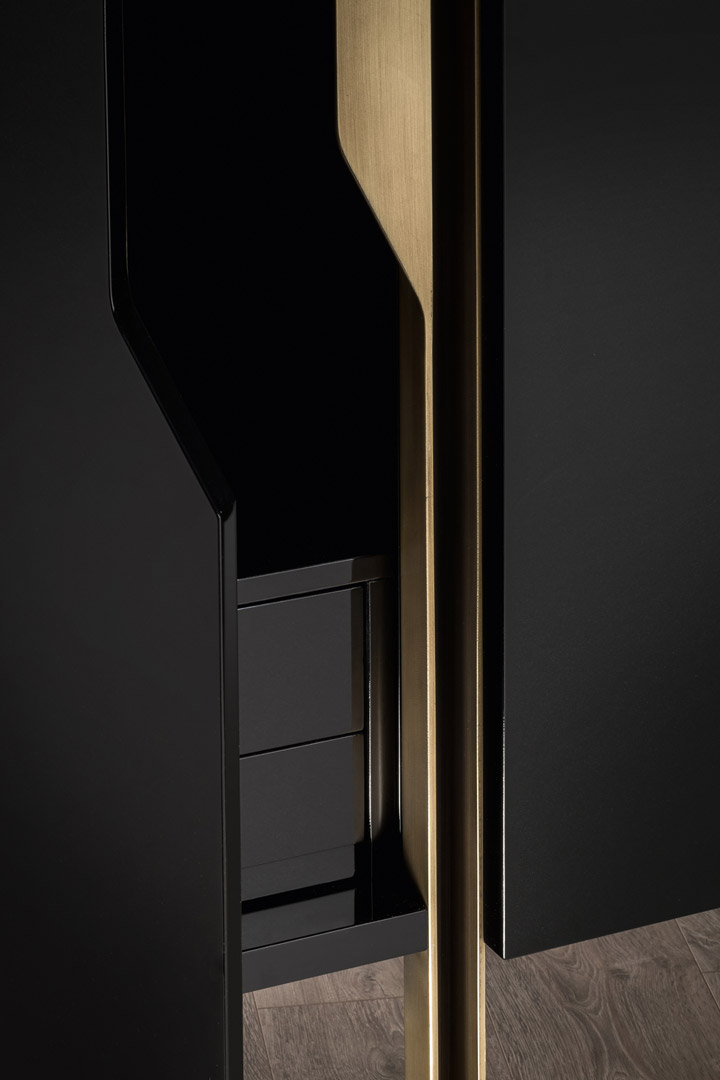 幻影柜或带两扇门的酒吧柜。 漆木结构与金属底座完美结合。金属,从底座开始,上升,并适合结构提出一个新的和精致的装饰效果。内部空间由抛光线地面形状的玻璃架和四个抽屉分割。幻影柜的基本线条具有强烈的美感标志,能够增强任何环境。