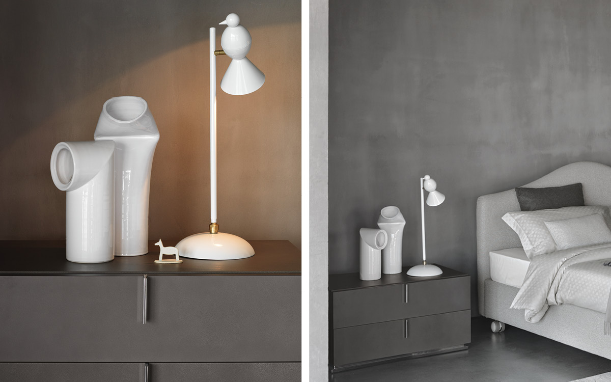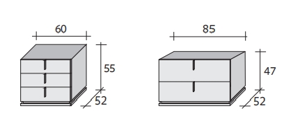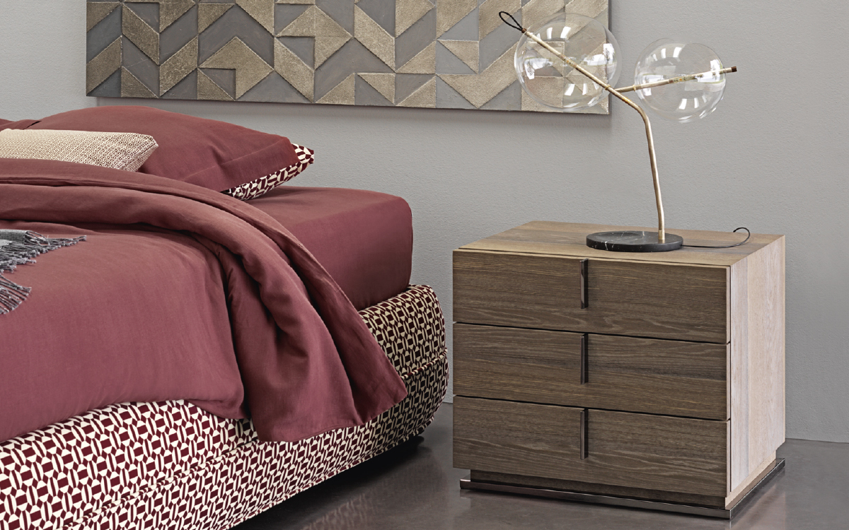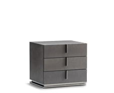 夜桌和高大男孩的木结构已被哑光漆"galuchat"效果装饰,有两种颜色可供选择:沙漠和拉古纳。珍贵的版本在化石木材为三抽屉床头柜和高大男孩。抽屉配有软闭合机制:内部是黑色染色:手柄和底座是抛光黑镍。