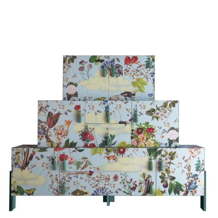 2020 年,卓越的美学实验室 Driade 提议扩展 Ziqqurat 系列的标志性图案:带有流苏的浪漫花卉版本或带有黑色手柄的白色和黑色几何版本。因此,该系列增加了新的“必备”产品,这些产品添加到具有三种高度和垂直高度的模块化容器中:小容器和专为现代生活空间和生活方式而设计的超小容器。此外,经典的 Ziqqurat 以花卉图案与新的青色漆面饰面相结合,带有青色流苏。