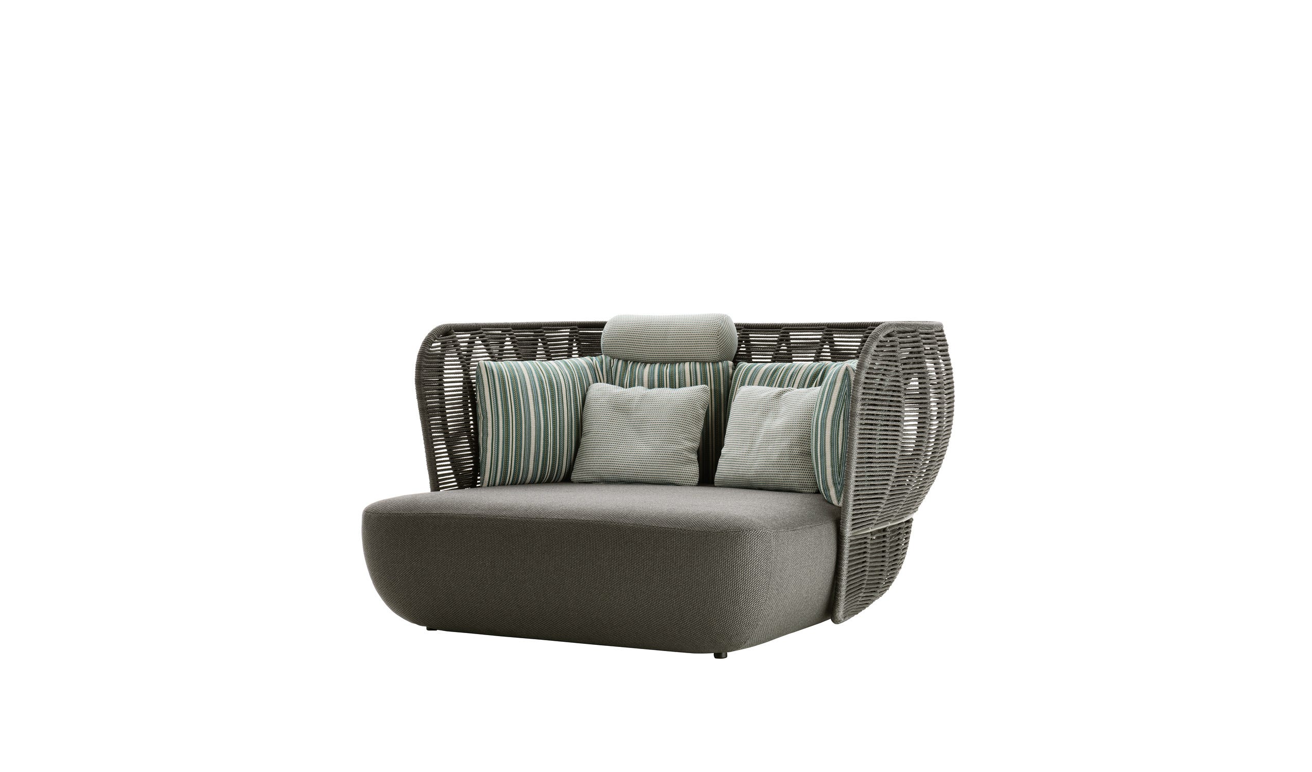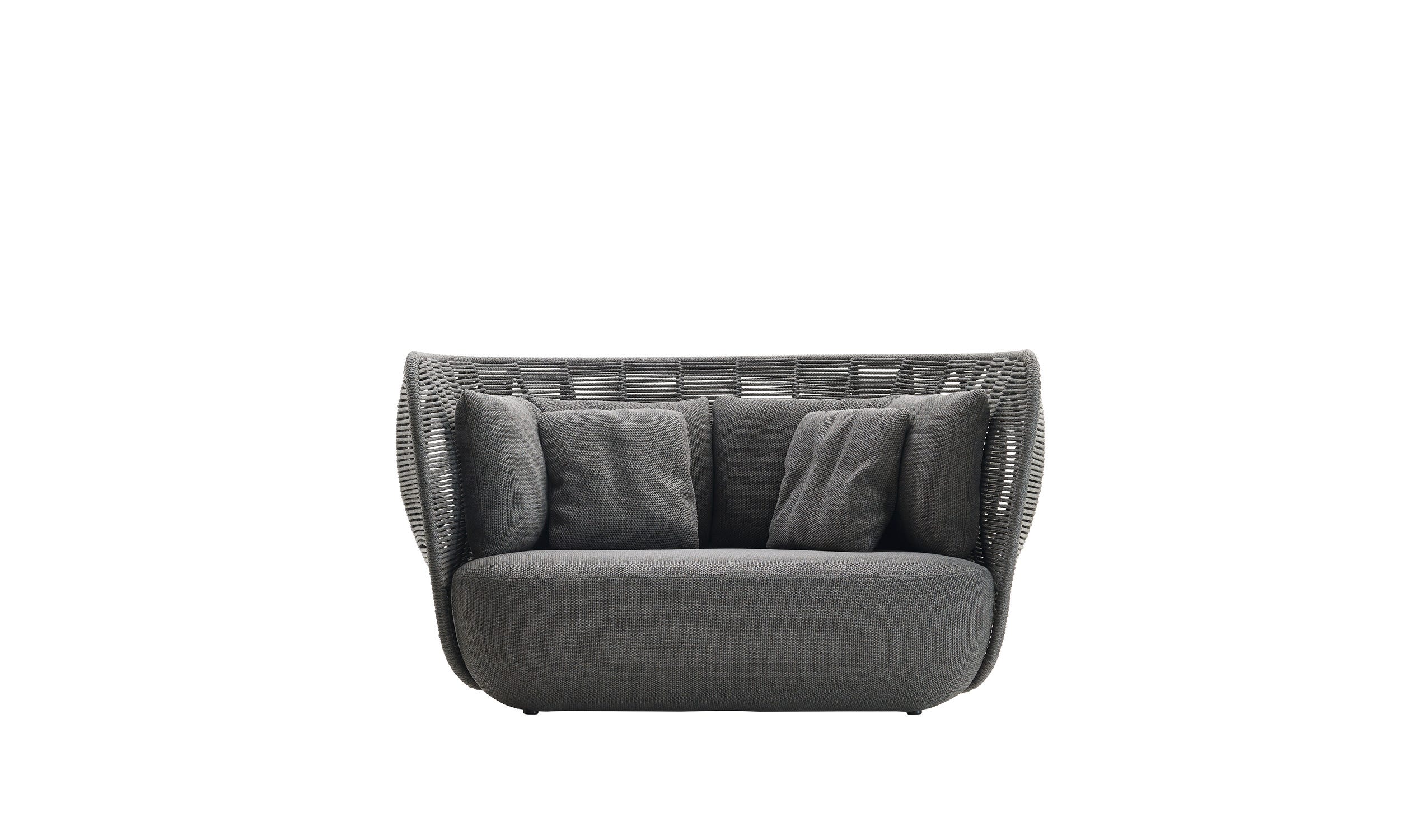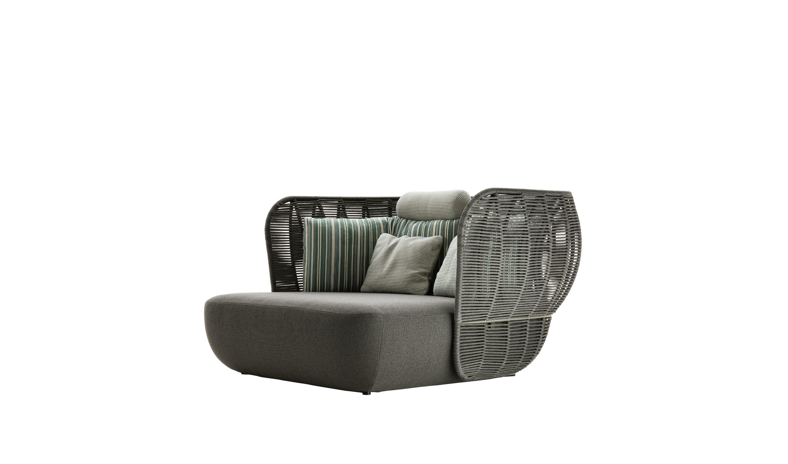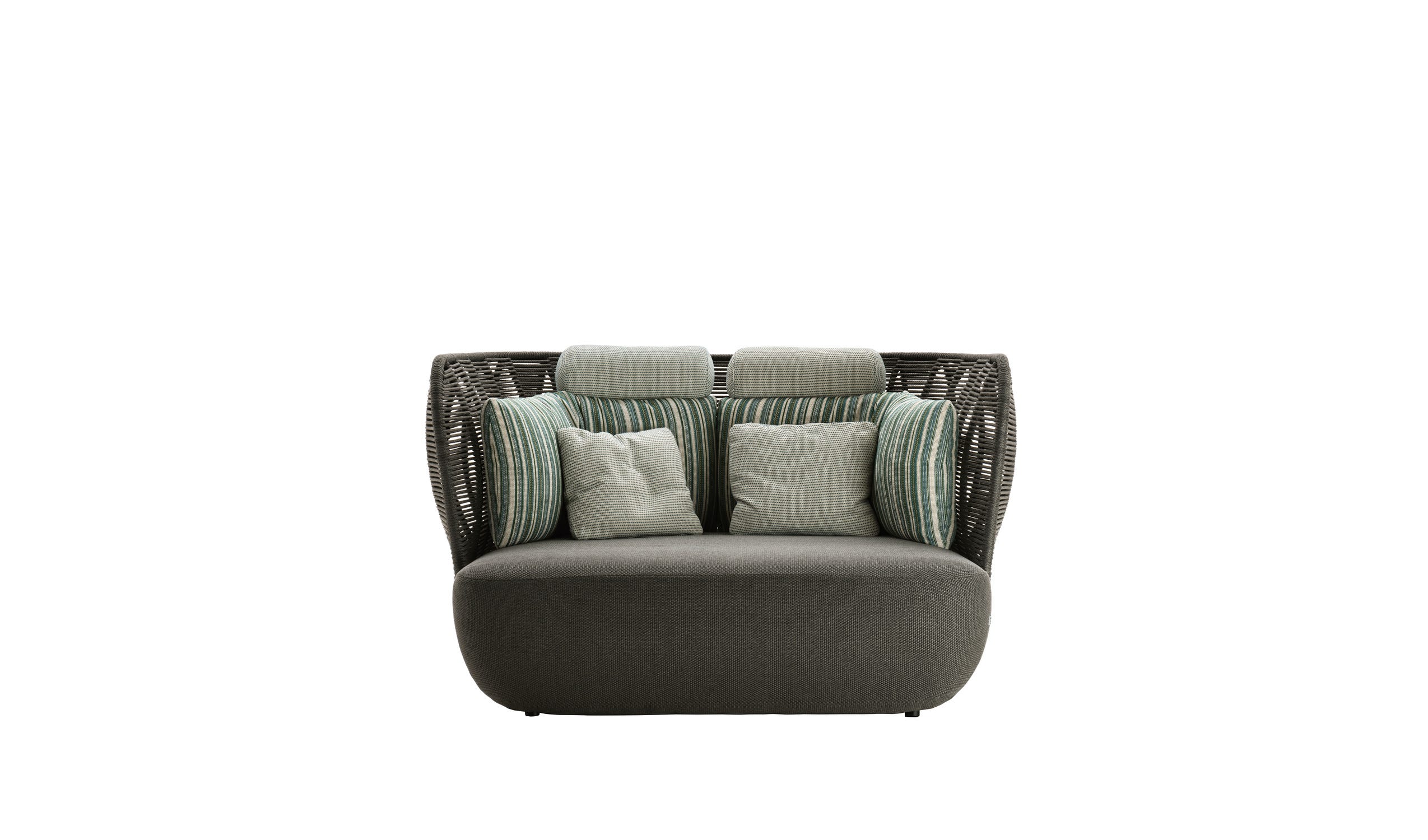 Bay 两座或三座户外沙发以其雕塑、整体设计而引人注目。环绕的双编织卷创建气囊,使收集的透明度和轻盈度,而填充岩石般的座椅和软垫反映了室内产品的优雅,舒适和精致。