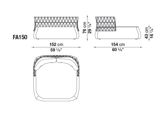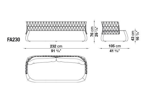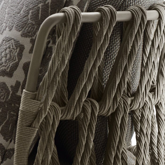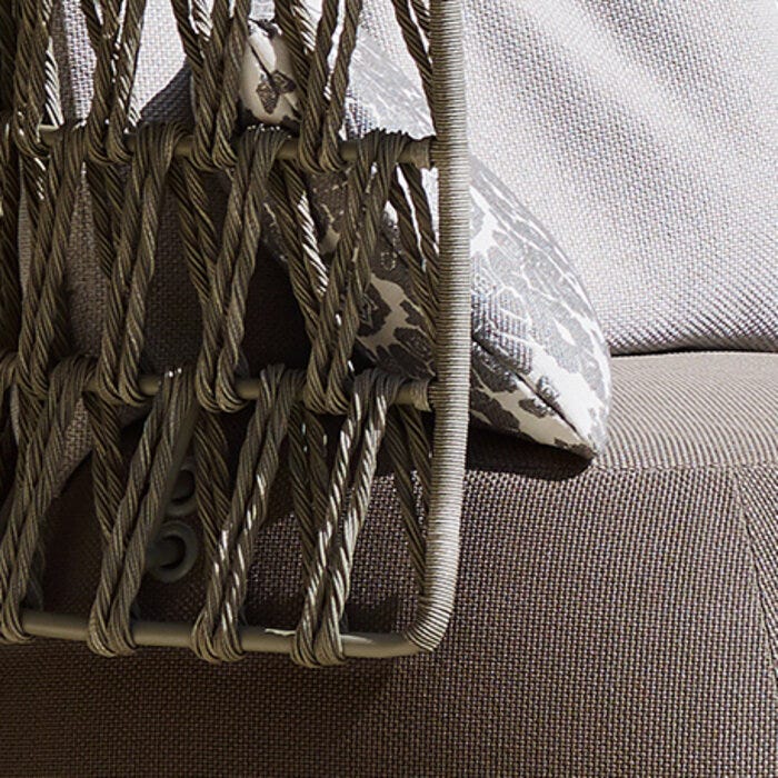 Fat-Sofa 户外系列以其圆润、柔软和曲折的形状而引人注目,与同名室内系统的特点相呼应。其全填充座椅配有一个背面,配有金属框架,支持原始编织,由鸽子灰色扭曲的聚乙烯纤维制成。一种具有图形效果和宏观尺寸的技术,使设计独一无二,尊重设计师的轻盈和透明性理念,并将家具与周围环境进行公开的"对话"。Fat-Sofa 户外系列包括两种尺寸的在线沙发和一个大的休闲座椅。该系列还配有扶手椅,两个高度的靠背和不同大小的脚凳。