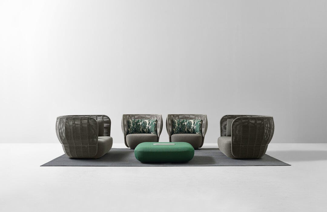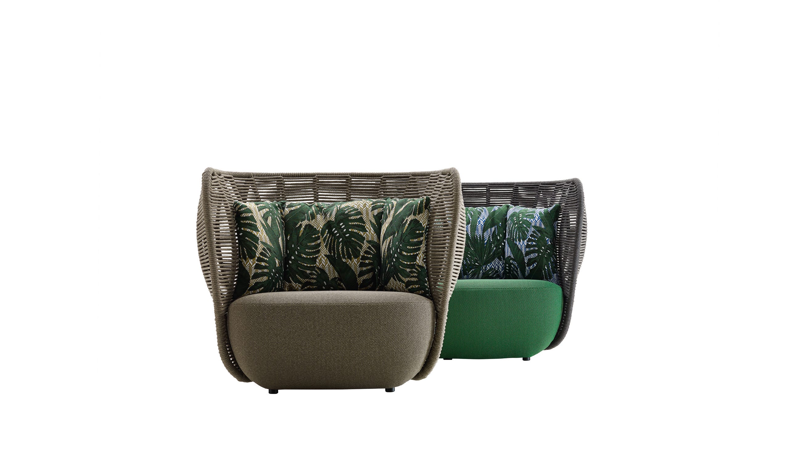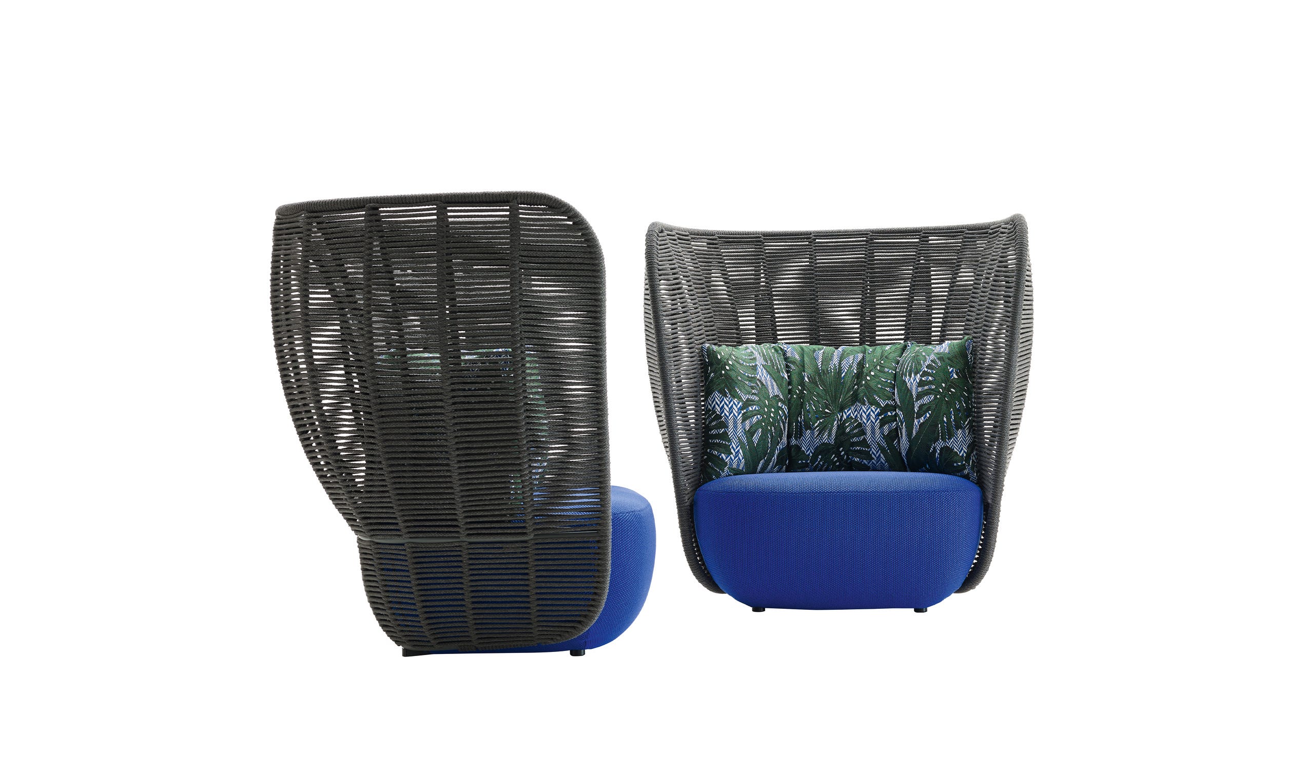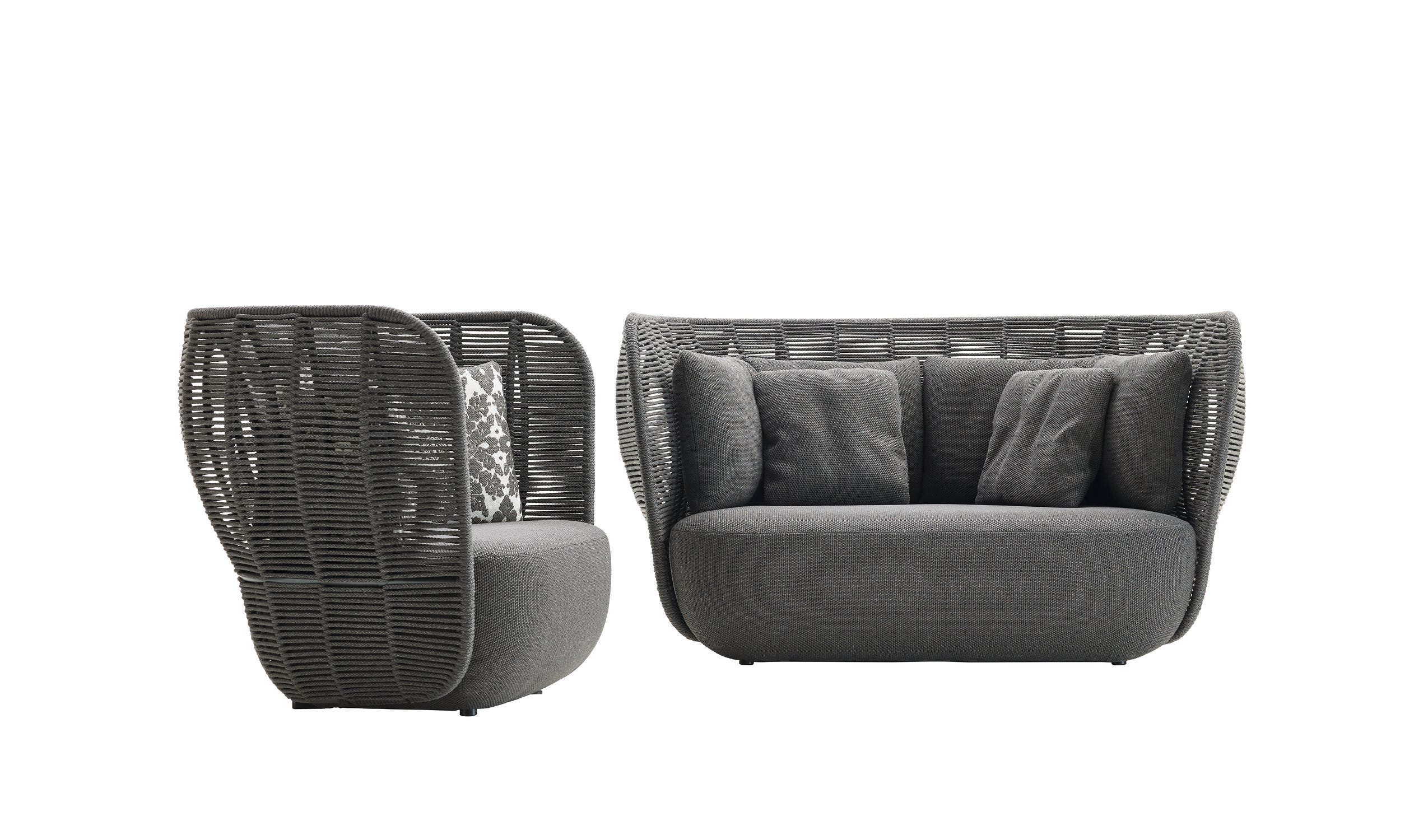 Bay 是一个雕塑,单片收集编织的户外家具。环绕编织的卷与填充岩石般的座椅和柔软的靠垫相结合,反映了意大利B&B室内产品的优雅、舒适和精致。感性形状,他们的双编织创建气囊,给予透明度和轻盈的集合。