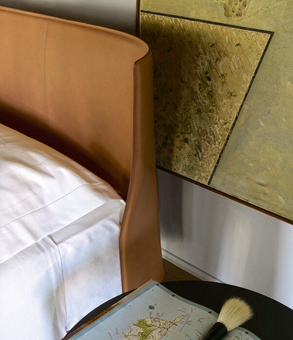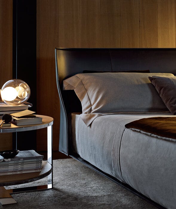 一块皮革"捏"在两个地方的基地:这里是阿里斯床头板的运动和自然倾向的起源。具有欢迎和保护形状的头板,具有极大的正式有效性,其周围有细长的边条,以长缝为标志。床架可以放置在两个不同的高度,这要归功于床提供的两套脚。