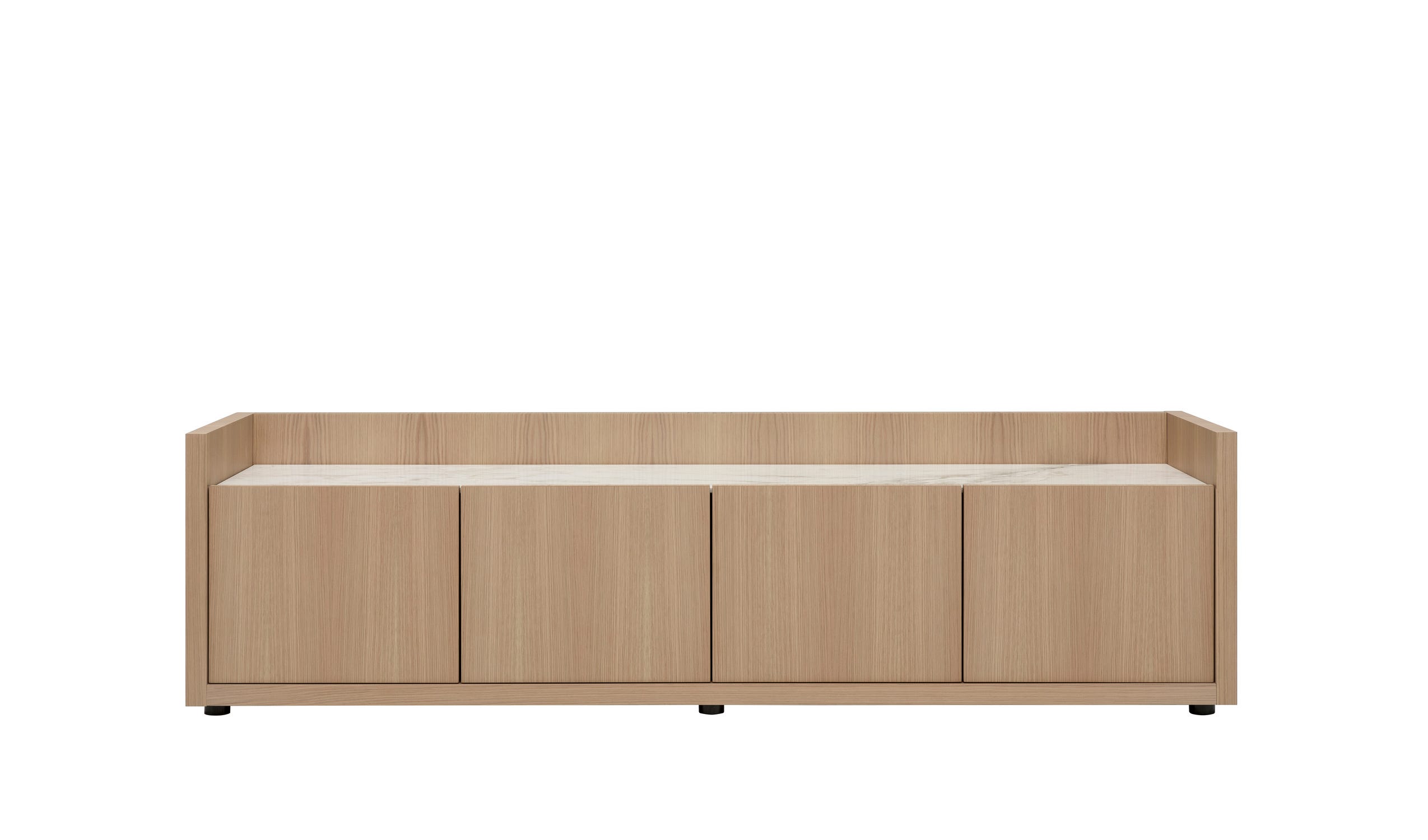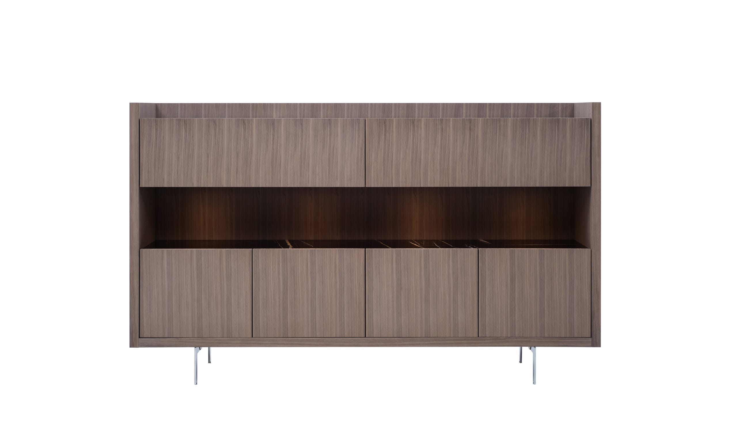 Liagé 系列非常适合用餐和起居区,包括两个带门和抽屉的低存储单元以及带铰链或皮瓣门的高储藏单元。这些单元由清晰的线条和增加的厚度定义,灵感来自威尼斯建筑元素(一种由木材制成的户外木屋,通常带有大理石地板),之后它们被命名。就像建筑物一样,50毫米厚的单元框架隐藏着一个功能灵魂:侧板和后面板通过"折叠"机制组装,以创建一个内部隔间,允许电缆和其他元素的通过。这意味着这些装置可以容纳电视、显示器、灯具、扬声器和其他有线设备的电源电缆和连接。无论是直接放置在地板上还是在钢制脚上,Liagé 存储单元都位于不同的树林中,并涂有多种光泽和缎面色调,顶部有大理石选项。内饰覆盖着丝质、防刮、防指纹、哑光无烟煤材料,货架上则用烟熏蚀刻玻璃制成。该项目还包括抽屉与令人难以置信的薄框架和配件,如拉出托盘灰色卡纳莱托核桃,保证额外的定制性和多功能性。Liagé 可配备内部照明系统和高存储单元的开放式隔间。此解决方案突出了内饰的非凡优雅,并允许其中包含的对象充其量显示。