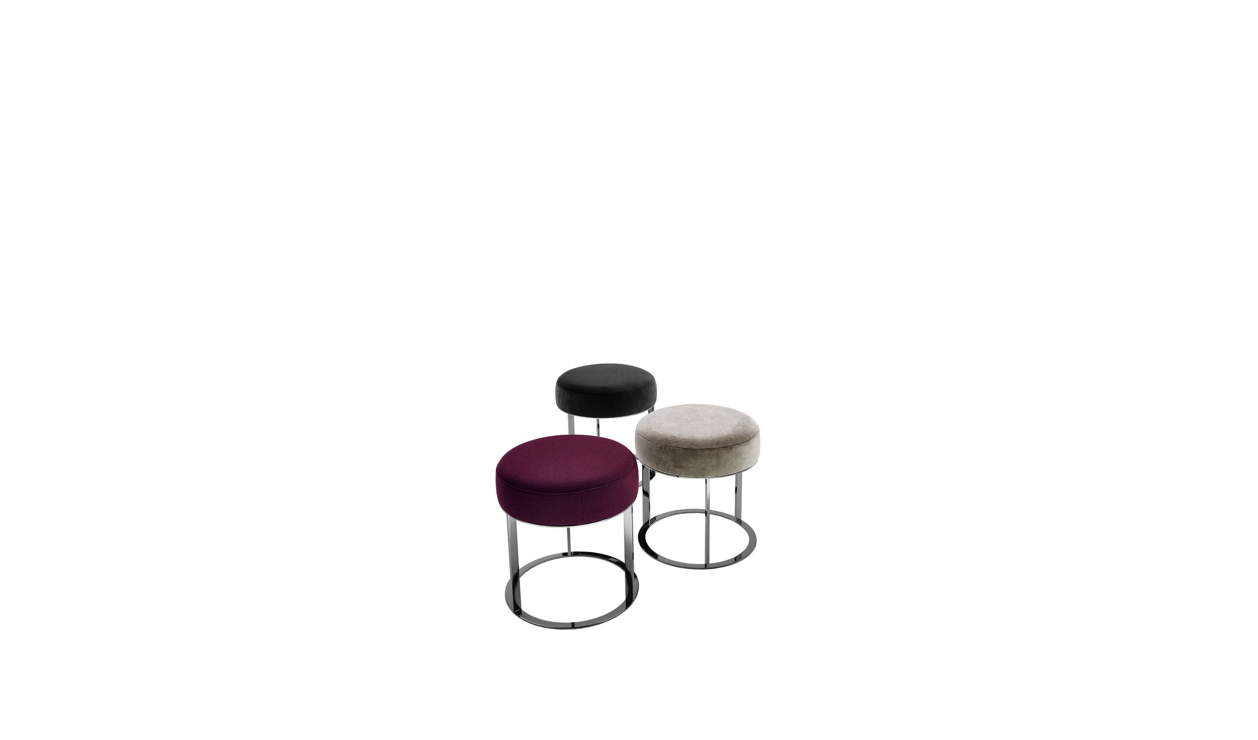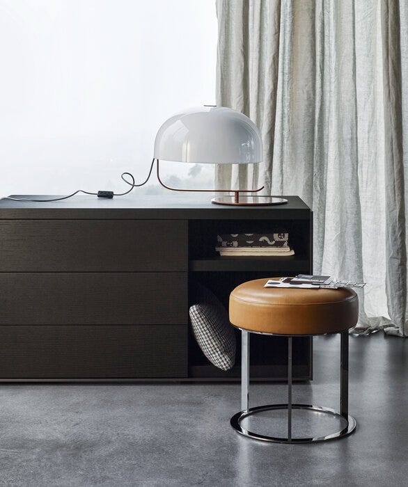 小型附加座椅或装饰元素,Frank 脚凳有两个版本:高圆形靠垫和钢结构在各种饰面,或完全软垫。对于这两种类型,室内装潢均提供织物或皮革。