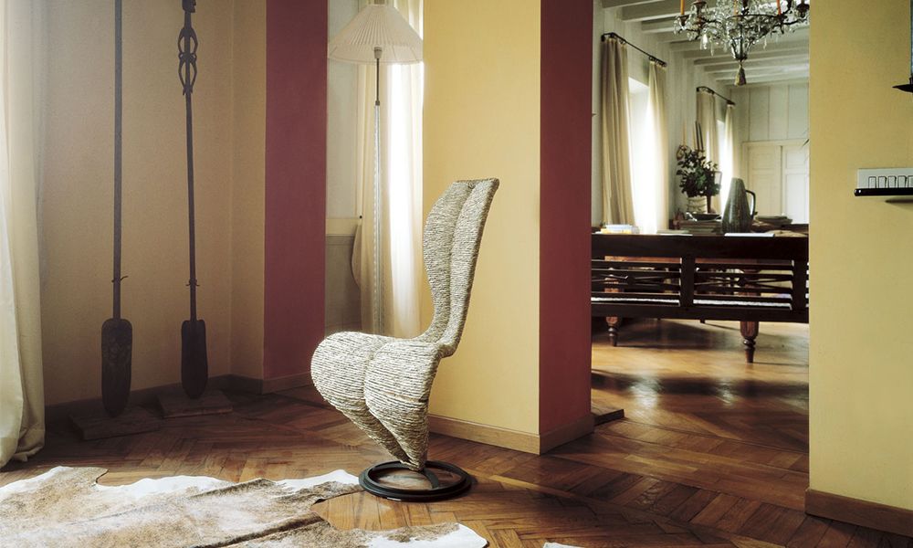 S-椅子有一个深色涂漆金属结构:标志性的原始版本用沼泽稻草装饰;或者,它也可以在柳条或固定封面选择从精选的皮革或面料从集合。对于沼泽稻草版本,编织完全由手工完成:一个细致的程序,需要超过6个小时的工艺。