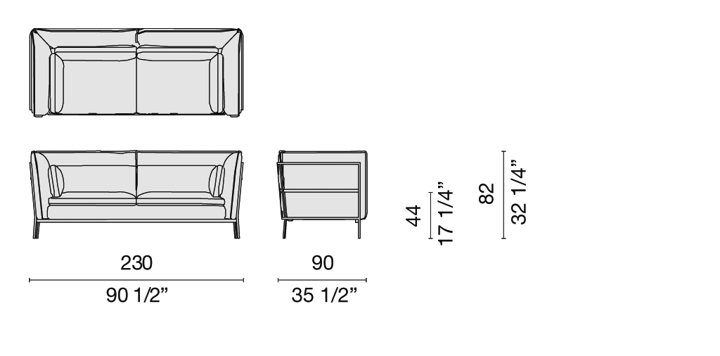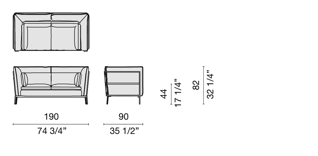 顶部靠垫缝合到下面的大垫子上,并用天鹅绒固定在结构上。靠背由拉链连接,扶手缝在靠背上。松动的背部和手臂垫大小和密度相同。