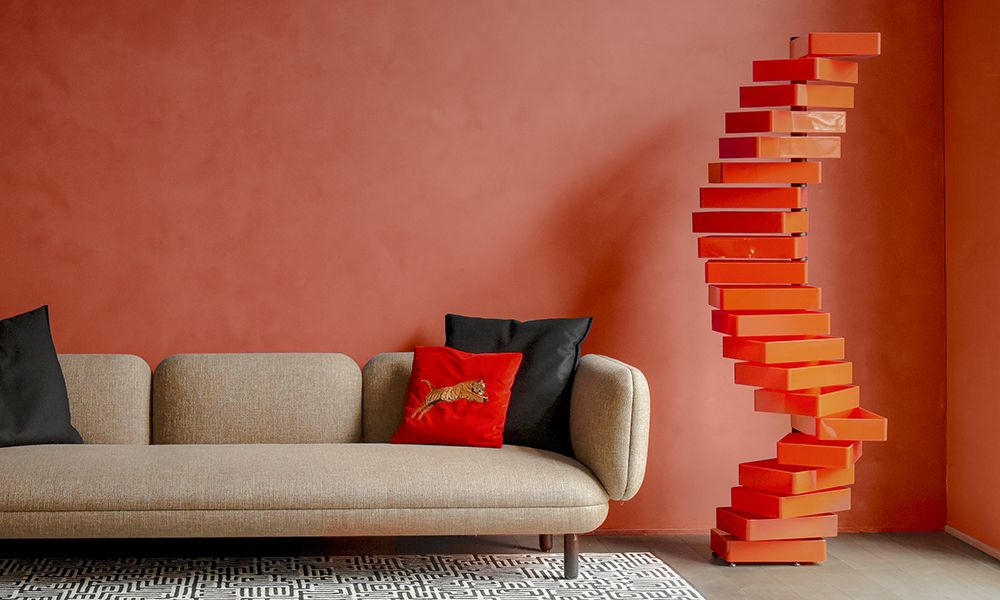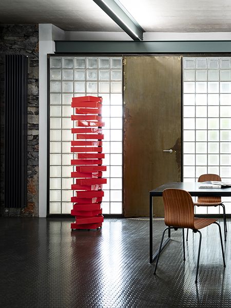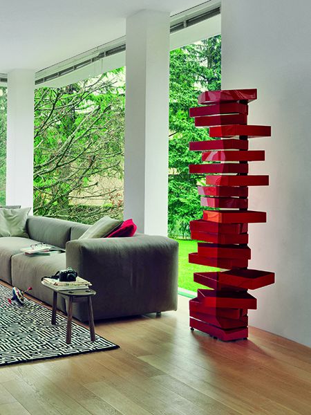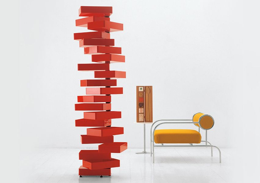 旋转柜看起来像一个移动雕塑:轻盈和创新,它是由Kuramata石郎设计的项目的完美标志。旋转柜由光滑的红色丙烯酸塑料材料制成,配有 20 个抽屉,可在垂直金属支架周围旋转。