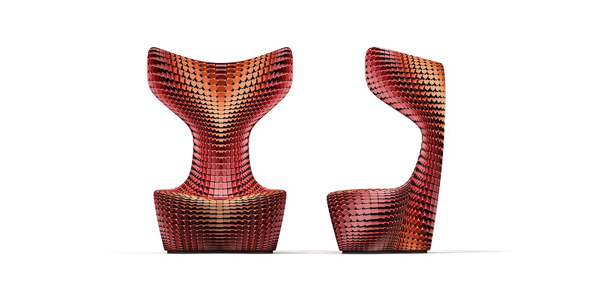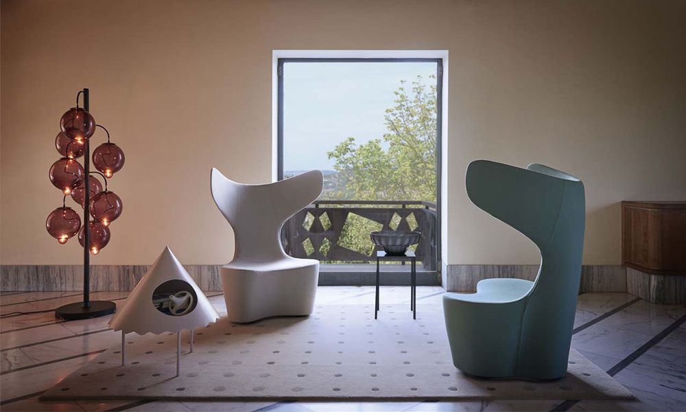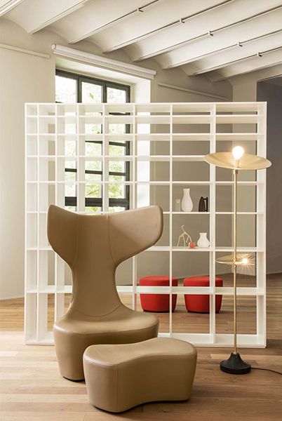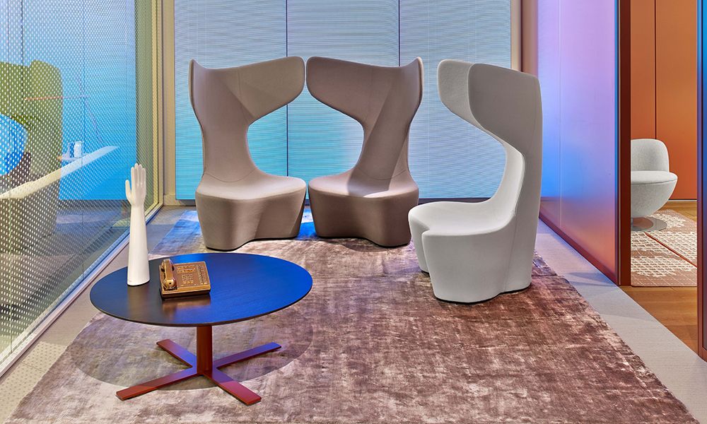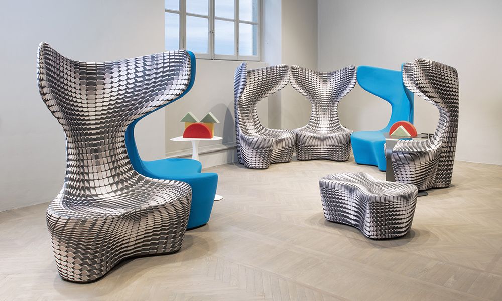 Mac Stopa和 Cappellini 为扶手椅和两个 poufs 提议的室内装潢包括一个带有 3D 光学图案的拉伸织物:一个源自几何色壳图案的图案。鼓扶手椅也提供从集合的面料和皮革的选择。