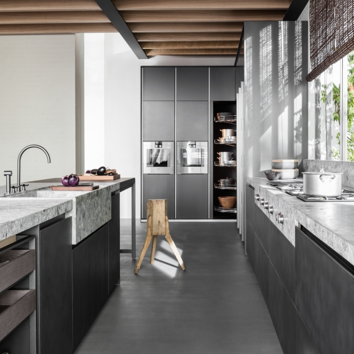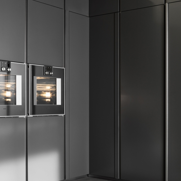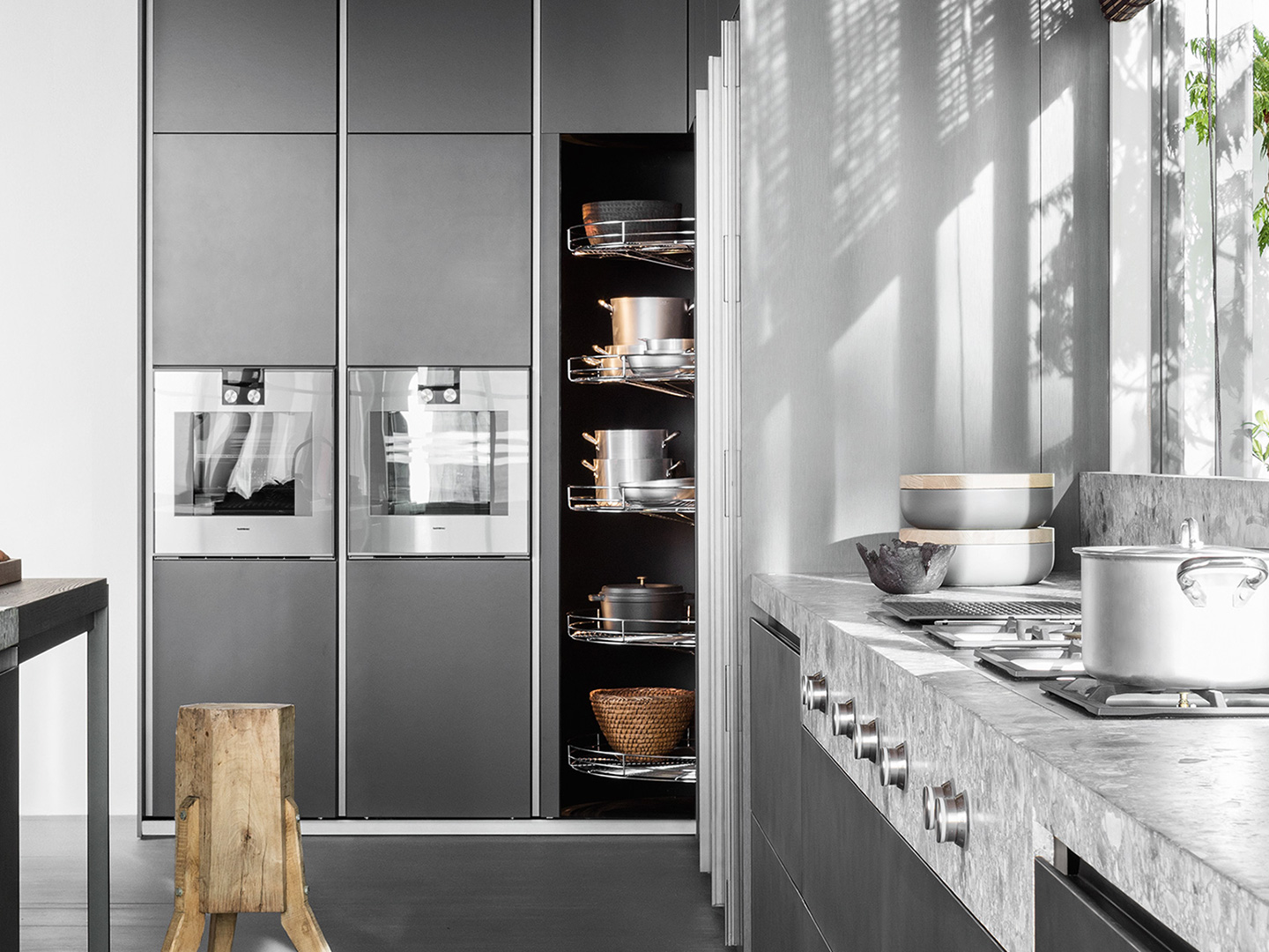 这套系统依赖于挤压铝的核心支柱以及有两组球形轴承控制的专利旋转机制。360°的旋转可以满足镀铬五个金属框架隔板的抽取。翻边的安全轮廓可以确保茶具柜在使用时的安全性。