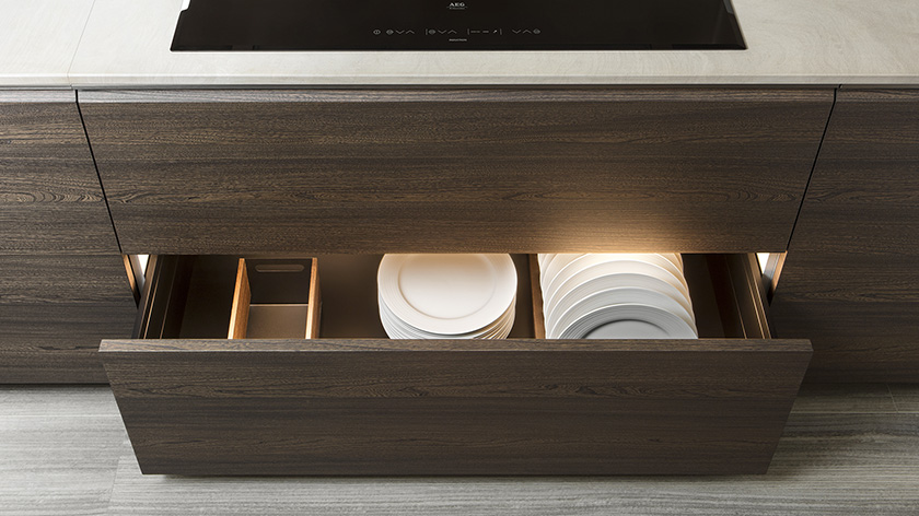 基础结构中可安装LED照明设施。打开柜门时自动开启照明。 LED灯适用于尺寸为450/600/900/1200毫米的抽屉和平底锅收纳架。变压器的数量根据抽屉的数量进行计算。