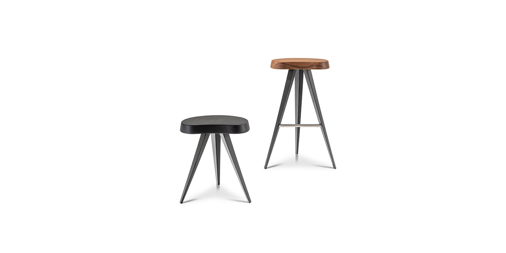 Mexique 家庭凳子,高 72 厘米。«en forme libre» 座椅采用实木制成,腿部几何结构轻盈,采用哑光黑色涂漆金属或亮面青铜色。