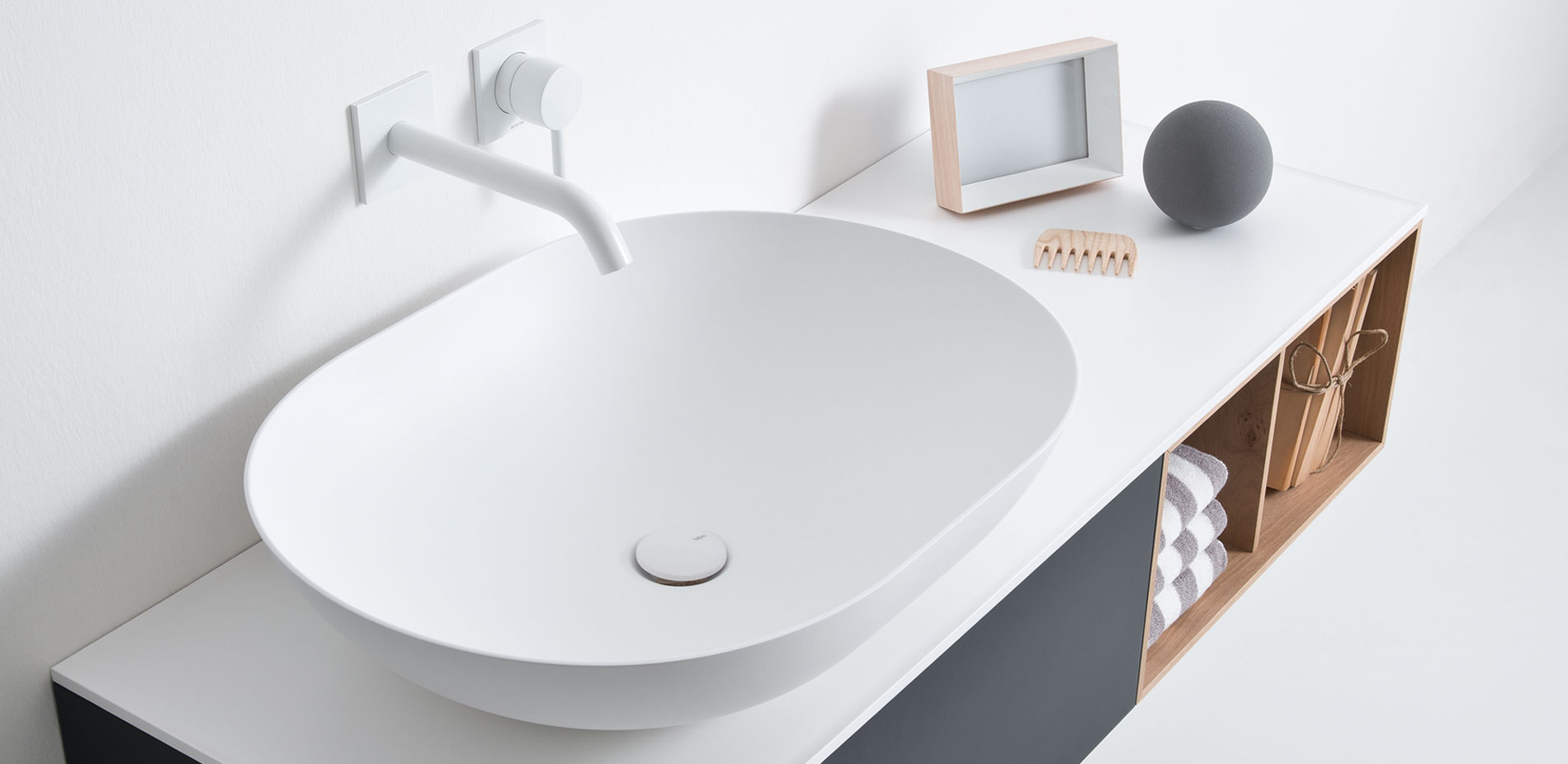 Ceramilux SSL 椭圆形台面洗脸盆只有 4 毫米厚。它采用可保证卓越品质和经认证的耐用性的材料制成,可回收、抗黄变、低过敏性和无毒。