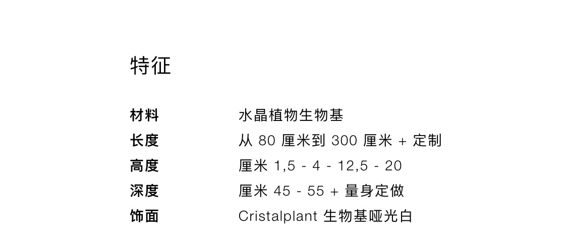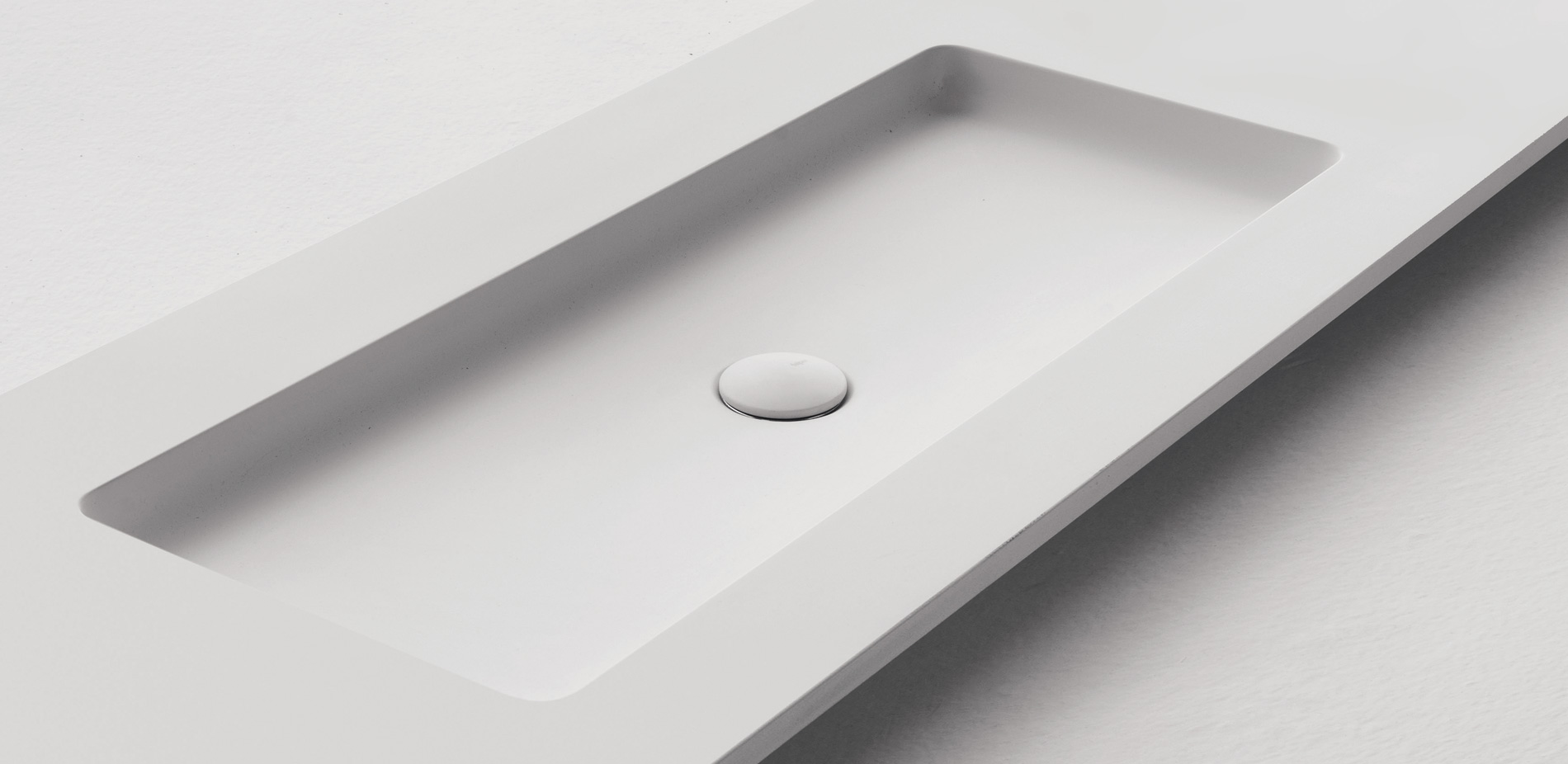 带有 Cristalplant Biobased 独特和独特设计的洗脸盆集成台面系列,在尺寸和厚度以及洗脸盆在顶部的位置方面具有无限的定制可能性。 Cristalplant Biobased 是世界上性能最好和经过认证的材料用于建造洗脸盆和浴缸,并具有独特的柔软均匀的触感和光反射效果。