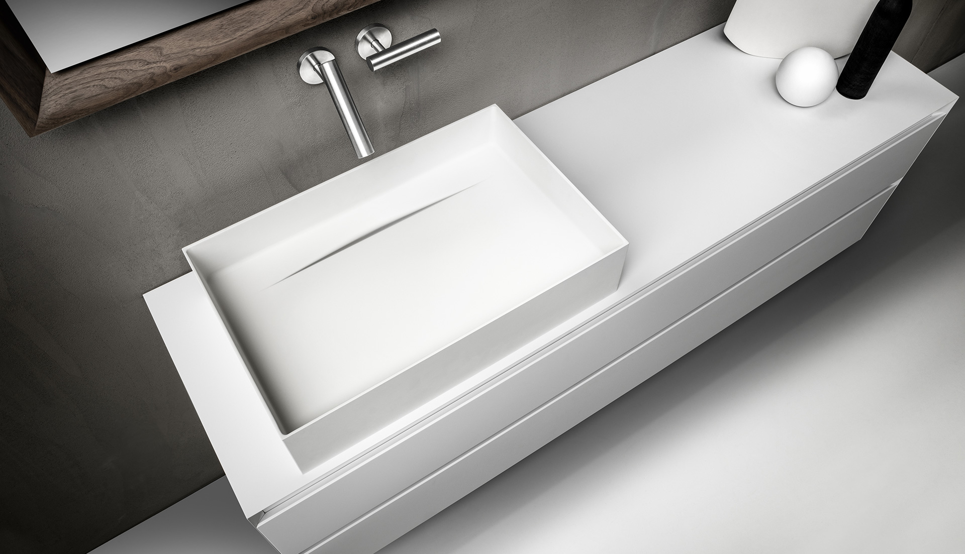 Cristalplant Biobased 矩形脸盆。每一个 Falper 洗脸盆都代表了设计和实现护理的参考点。使用的材料和可用的饰面使它们成为浴室的主角,它们被放置为台面、墙壁或地板元素。